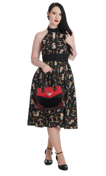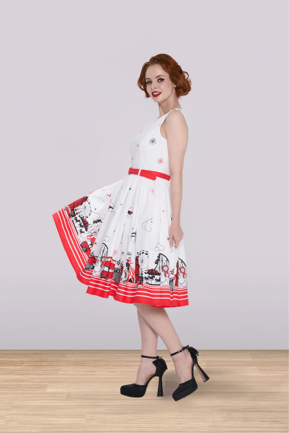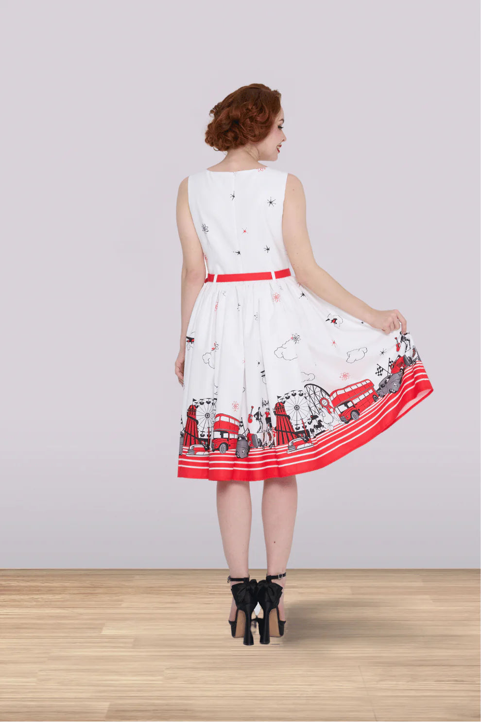 The "Audrey Atomic" dress is a quirky nod to 1950s charm with a modern twist. This sleeveless wonder features a crisp white canvas adorned with London's iconic skyline at the hem. Perfect for vintage lovers who crave a touch of urban flair.