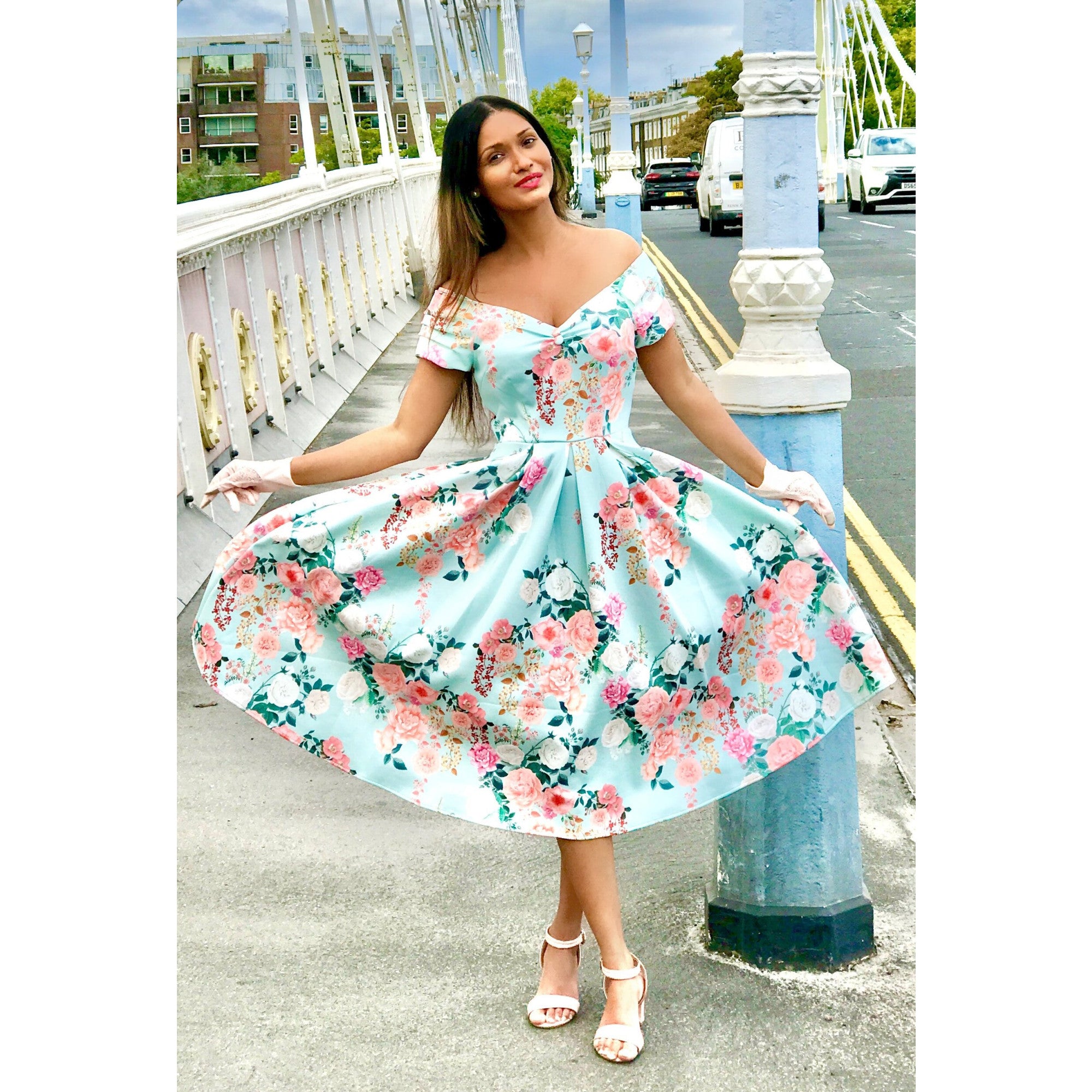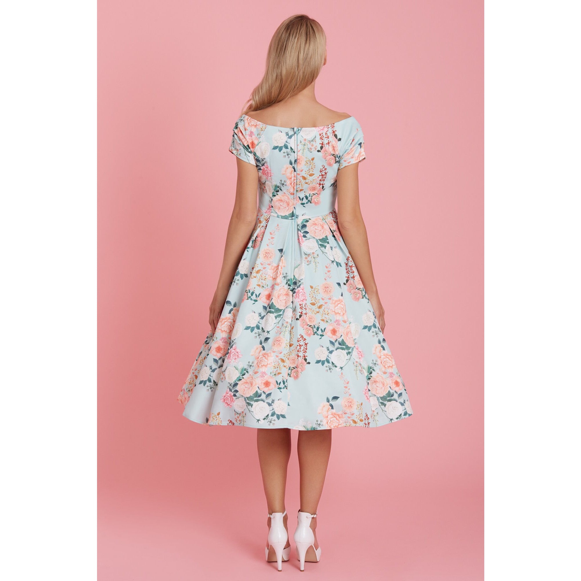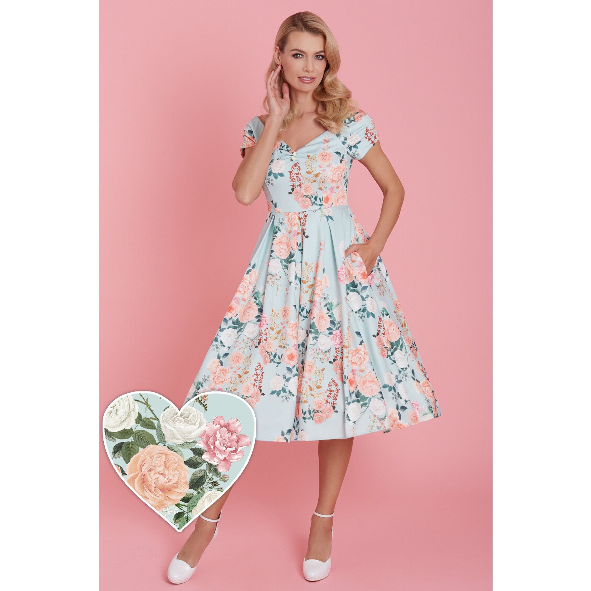 Meet Lily, our gorgeous swing dress with a beautiful off-the-shoulder neckline, a pretty gathered bust with the button detail, a flattering fitted waist, and a 50s style pleated, flared skirt. Made from lovely soft polyester fabric with stretch, this seductive style fastens at the back with hidden zip. The best thing about this dress? It has pockets!