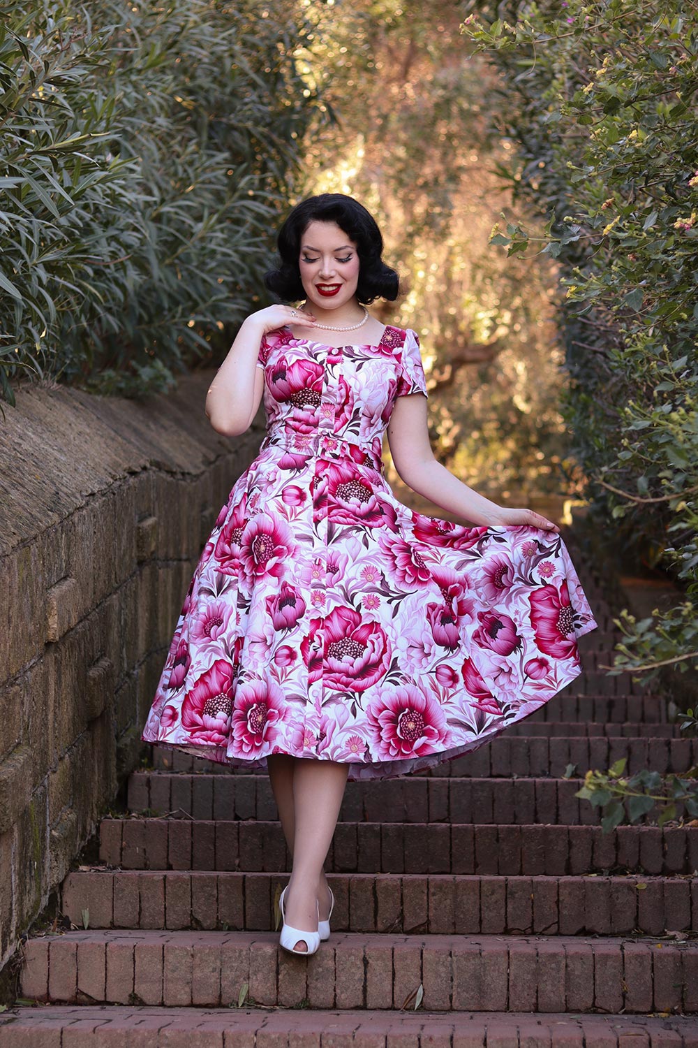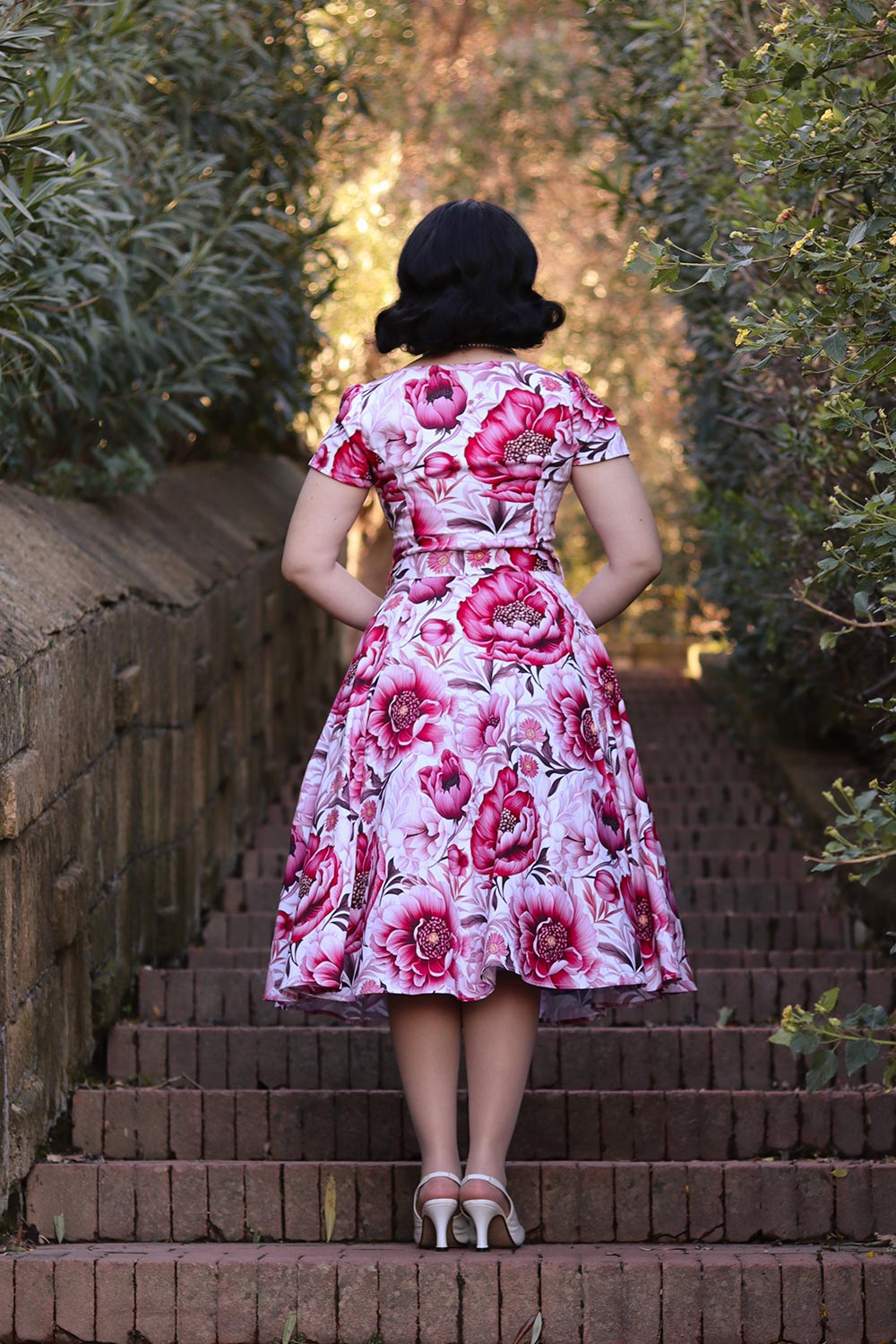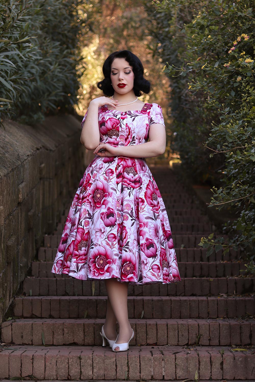 Embrace sophisticated retro style with our brand-new Camille Floral Swing Dress, a stunning piece that radiates vintage charm and femininity. Crafted from a soft white cotton blend fabric adorned with large, romantic pink florals, this dress exudes a graceful allure. Key features include a flattering sweetheart neckline and gathered short sleeves that add a touch of softness to the silhouette. The front button placket, accented with decorative buttons, enhances the dress’s vintage-inspired look. Practical details include a hidden side seam zip for easy wear, hidden side pockets for convenience, and belt loops with a matching self-fabric belt and buckle to accentuate the waist beautifully. Perfect for garden parties, brunches, or any occasion where you want to feel effortlessly elegant, the Camille Floral Swing Dress is a staple for any wardrobe