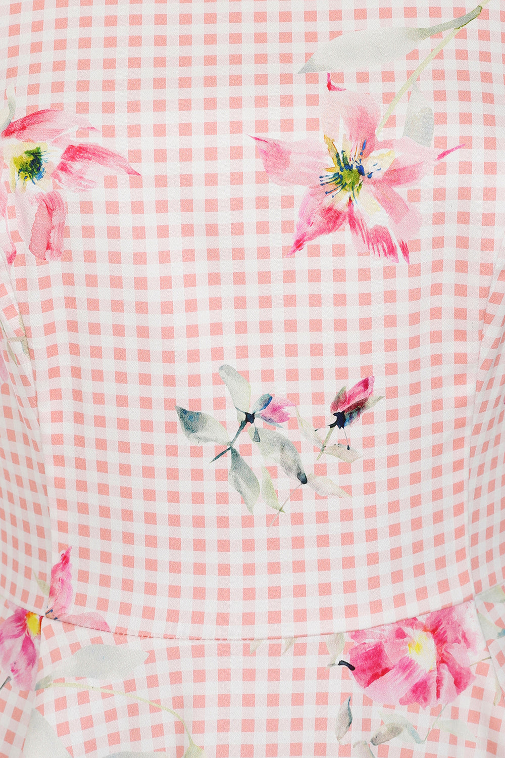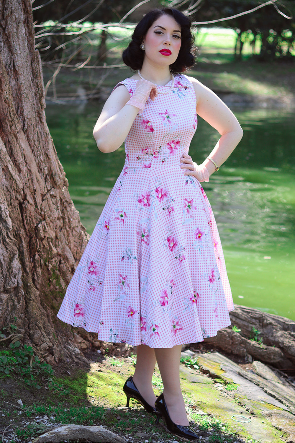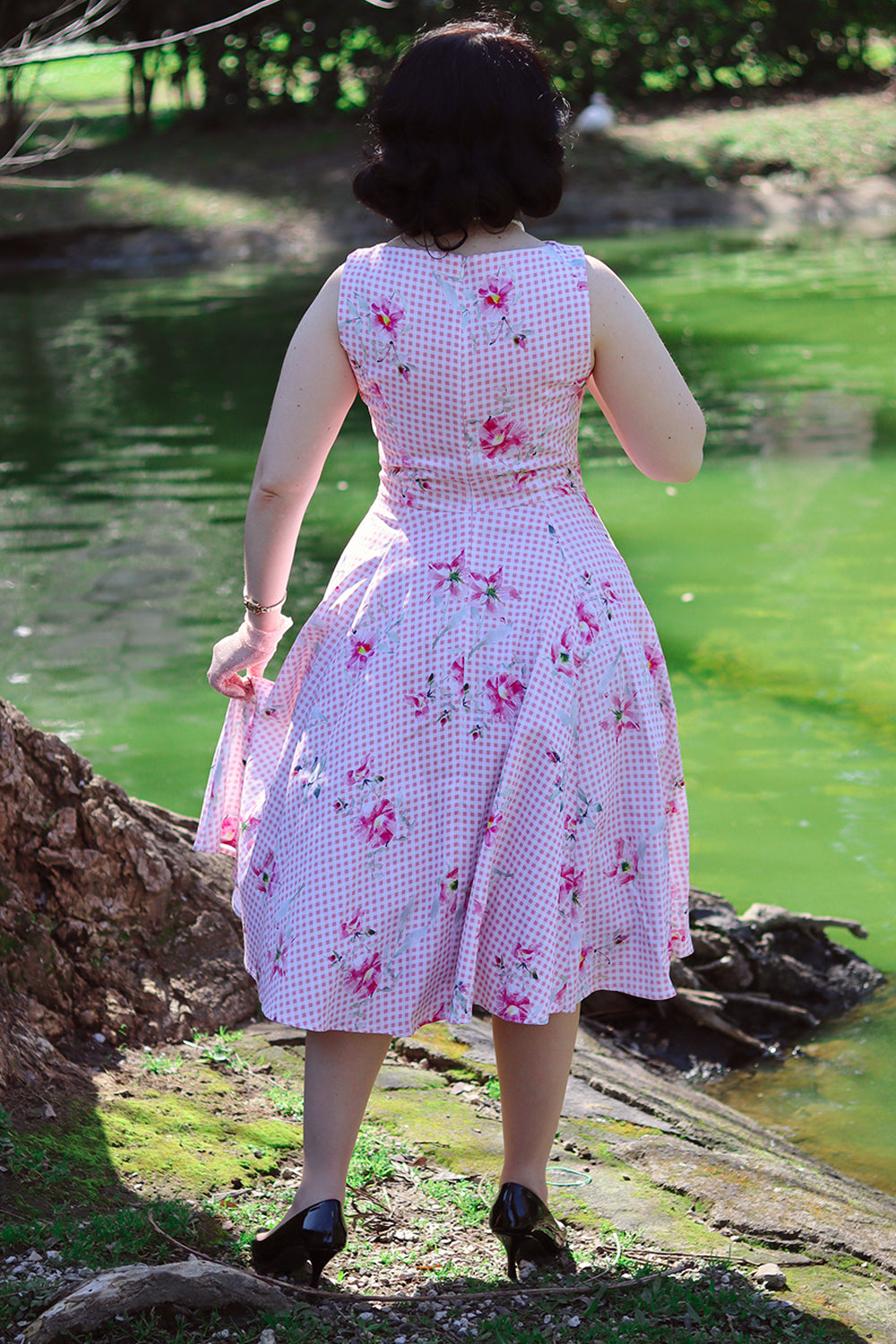 Introducing our Catherine Floral Swing Dress, where chic meets charm in a delightful dance of patterns and details. This dress is a perfect fusion of playful elegance, featuring a captivating pink checkered print adorned with subtle floral accents that effortlessly capture the essence of whimsical femininity. The boat neckline takes center stage, adorned with a lapel detail that adds a touch of sophistication to the ensemble and the lapel buttons enhance the dress's visual appeal. The swing skirt adds a fun and graceful flair to your every movement, making it an ideal choice for both casual and semi-formal occasions. Its breezy silhouette ensures comfort while exuding an undeniable sense of style. Meanwhile, the inclusion of practical side pockets adds a modern touch, offering convenience without compromising the dress's overall look.