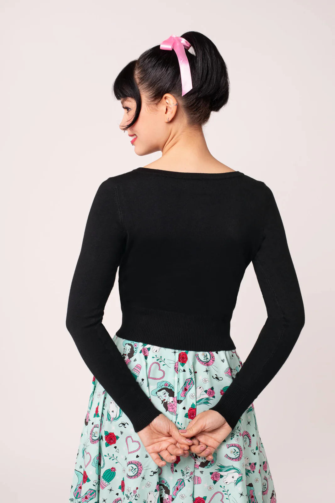 Embrace the cowgirl life with The Kellie Cardigan. This fitted style, soft knit black cardigan features intricate embroidery of a cowgirl portrait, framed with a horseshoe and luscious pink roses. Contrasting pink buttons line the fastening, adding a pop of colour to this adorable cardigan. Style with The Kellie Skirt for a matchy, western look, or mix it up with The Cherilyn Skirt for even more pink prettiness.