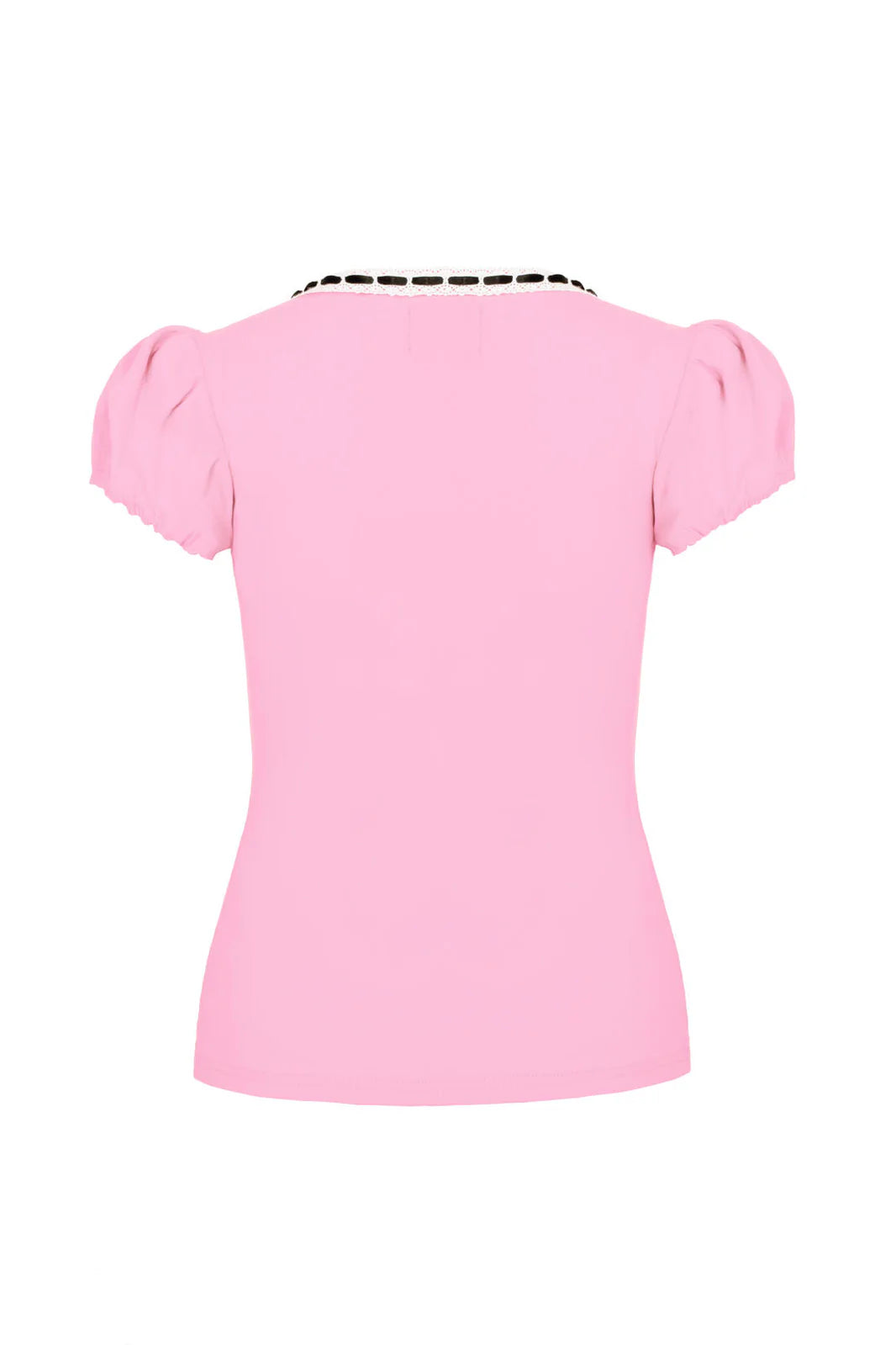 The best-selling Gracie Top is back, and in two new colourways! This fitted style jersey top, now in sweet shades of pink and red, features a scooped low neckline, decorated with white lace and black ribbon, with a dainty black bow as a finishing touch. The short puff sleeves have elasticated cuffs for both style and comfort. The length finishes at the hips, perfect for pairing with The Mel Skirt as pictured for a timeless, day-to-night look.
