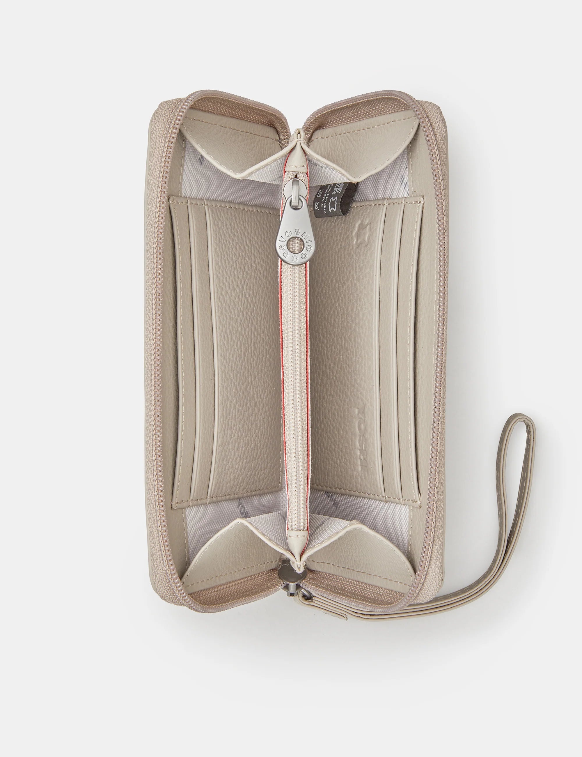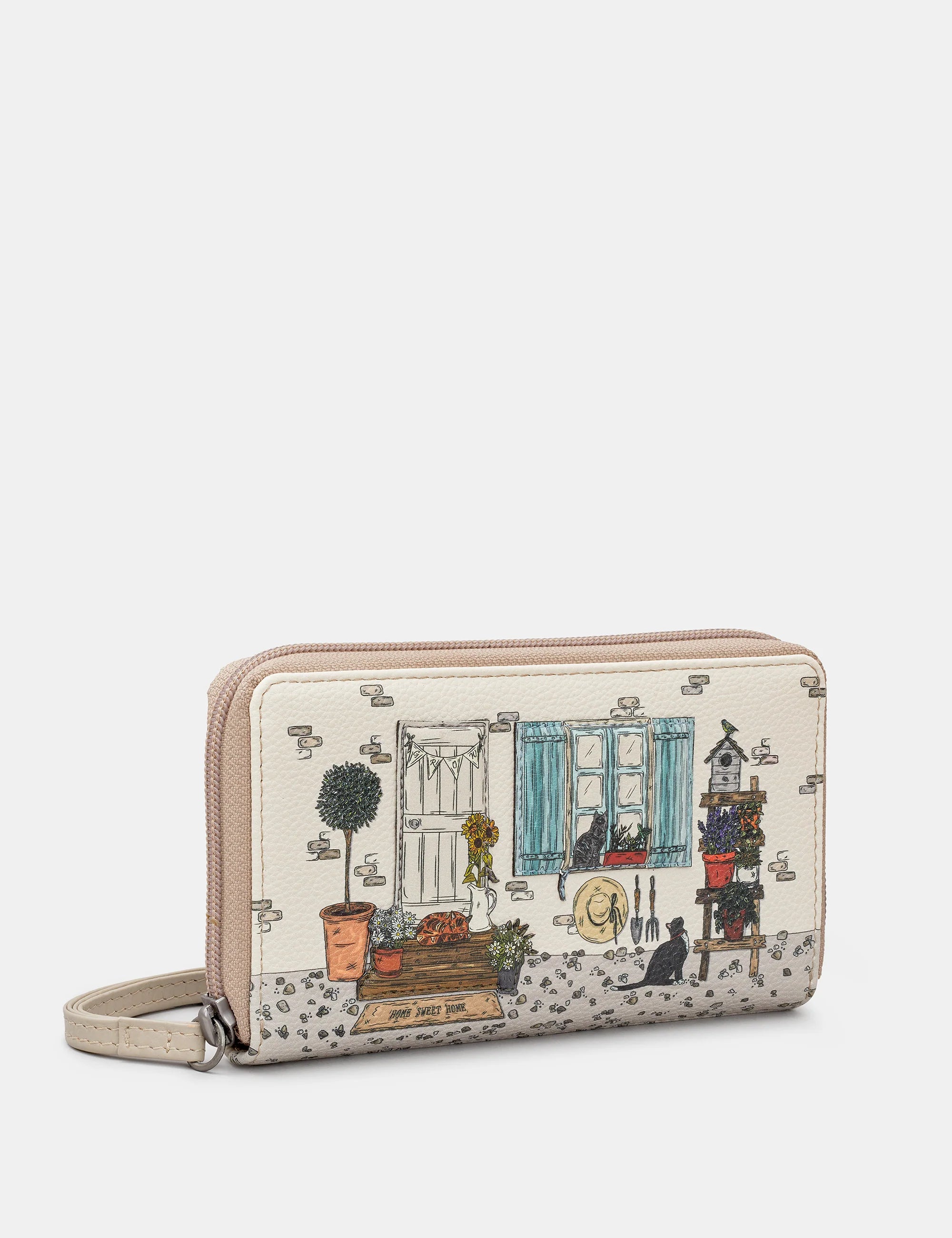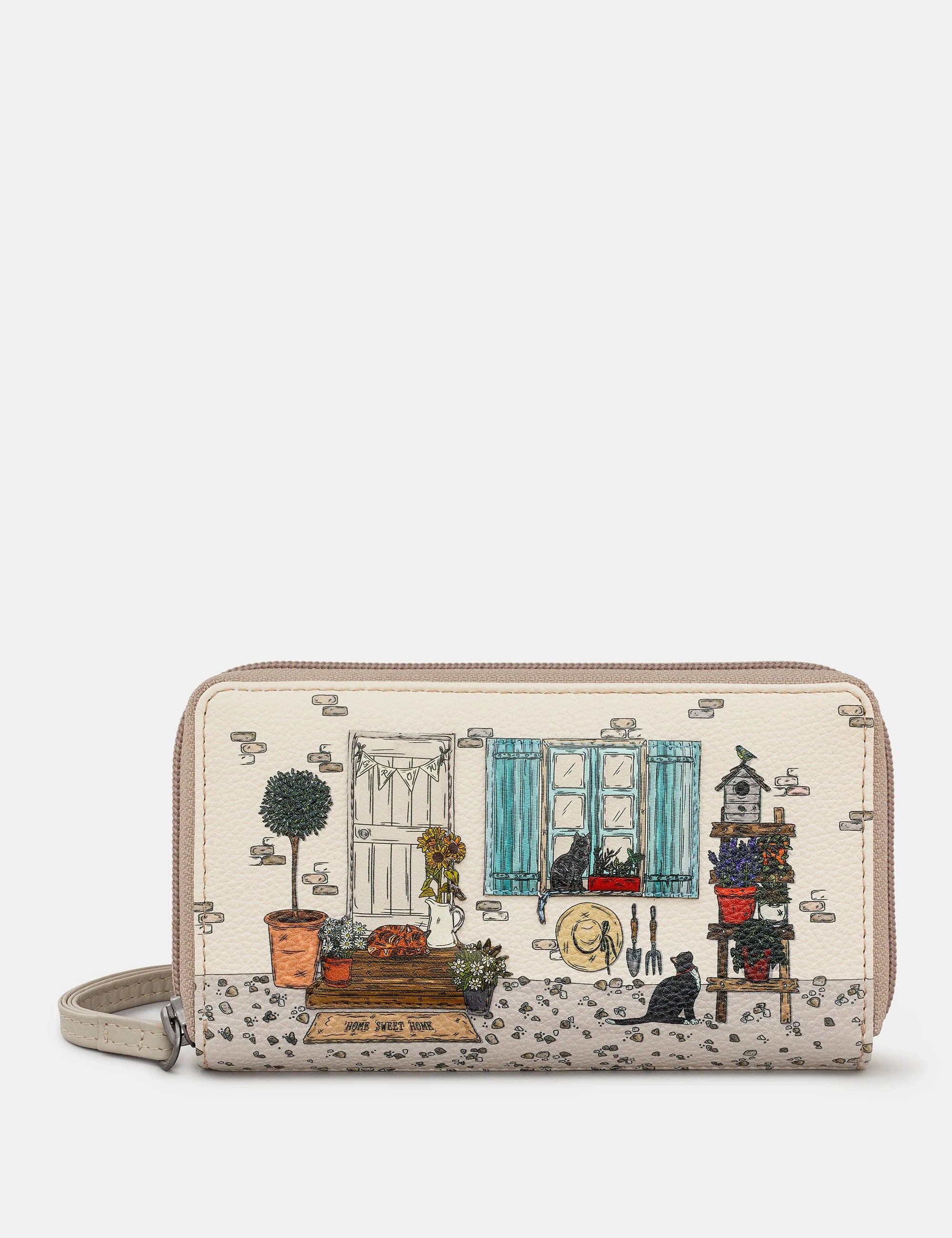 This soft warm grey leather purse with wrist strap is from our Country Cottage Collection and has RFID Protection for added security. The handcrafted applique scene on the front features three cats amongst the garden setting and flowers. This style is perfect for storing all of your essentials including bank notes, credit cards, and coins.