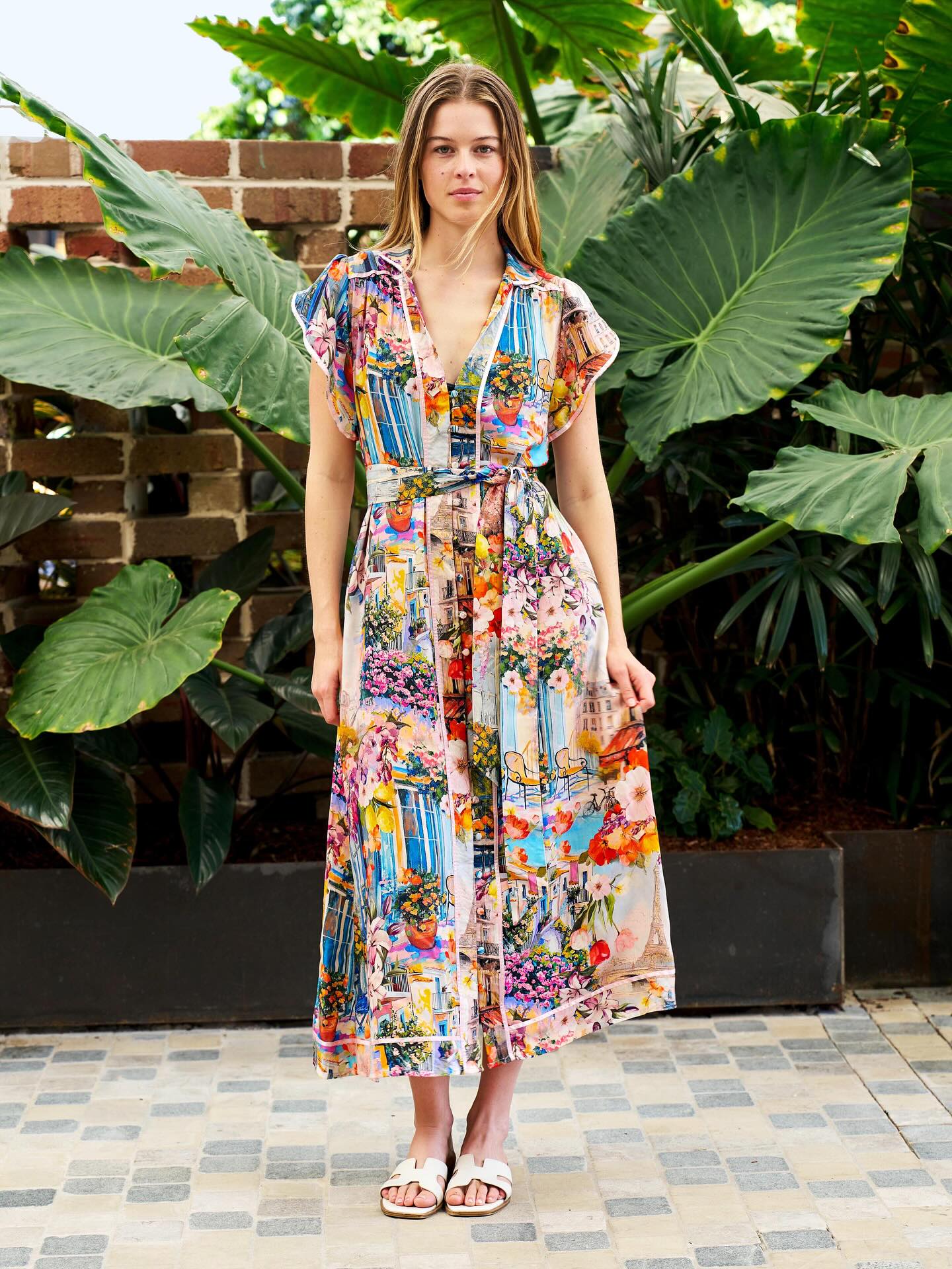 | Descriptions | – Small collar v-neckline – Button front detail – Tulip sleeve – No tiered skirt – Side seam pockets – Self fabric belt – Piping trim at neckline, front yoke, and front placket and hem |