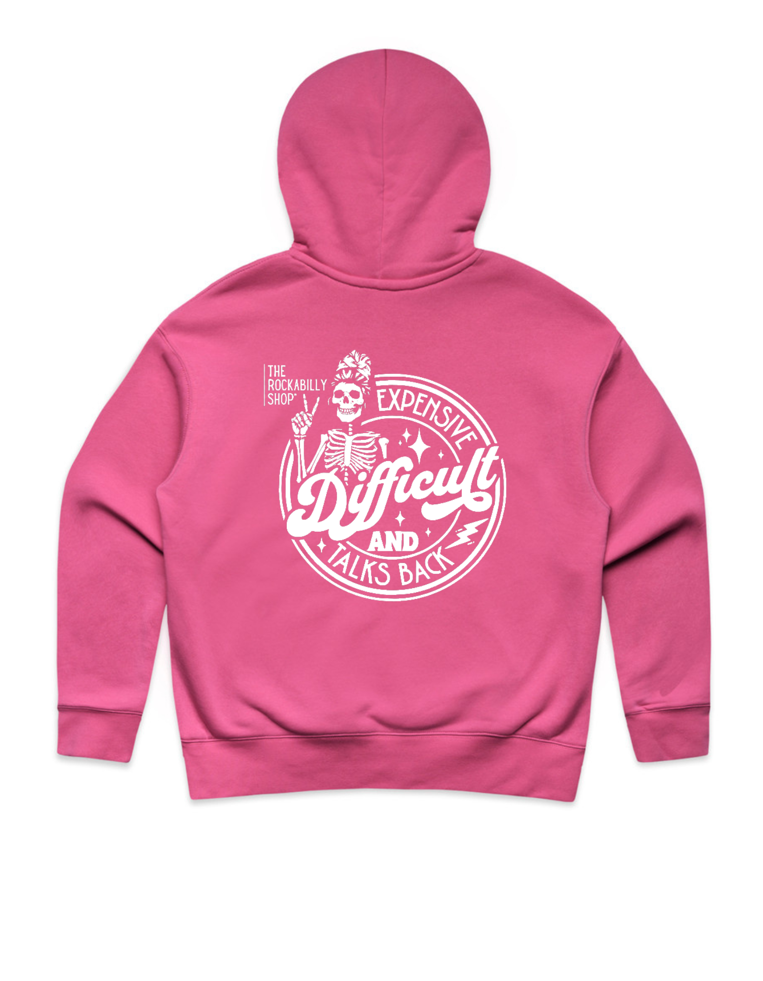 THE ROCKABILLY SHOP Expensive, Difficult and Talks Back Relaxed Fit Hoodie Charity Pink White Lettering