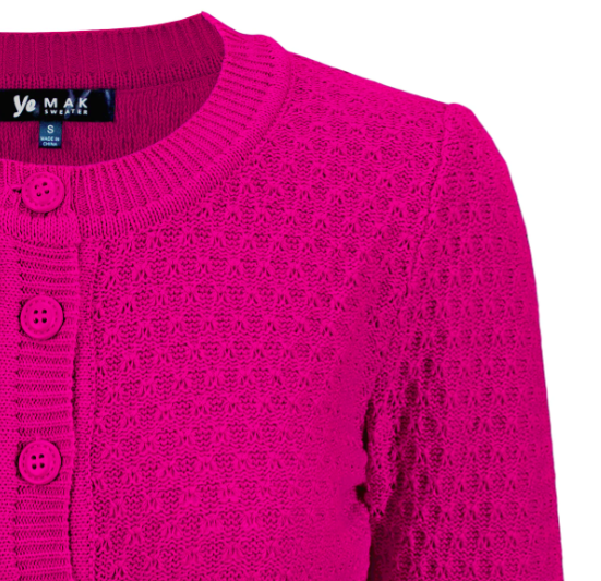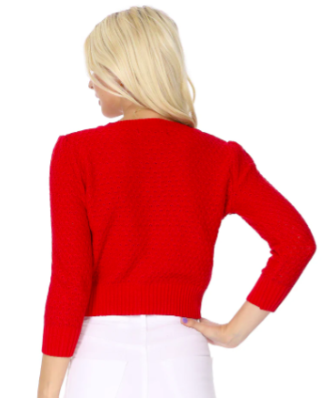 - 21.5"-22.5" Crop Length, 3/4 Sleeves, Round Neck Knit Cardigan Sweater with Adorable Vintage Buttons All the Way Up to the Crew Neckline, Ribbing Detail at Collar, Cuffs, and Hem.