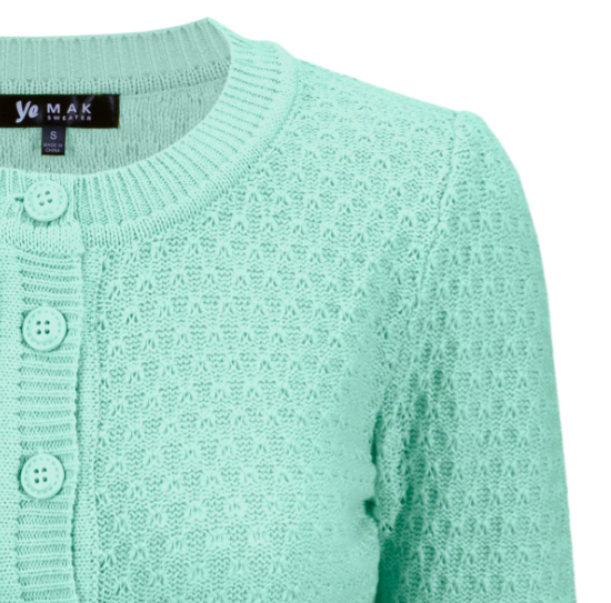- 17.5"-22.5" Crop Length, 3/4 Sleeves, Round Neck Knit Cardigan Sweater with Adorable Vintage Buttons All the Way Up to the Crew Neckline, Ribbing Detail at Collar, Cuffs, and Hem.