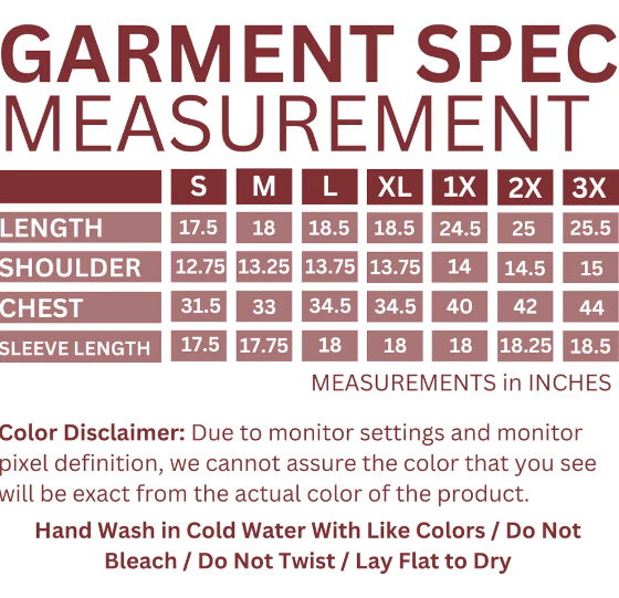 - S - Length: 17.5 in. / Shoulder: 13 in./ Chest: 32 in. / Sleeve Length: 17.5 in.