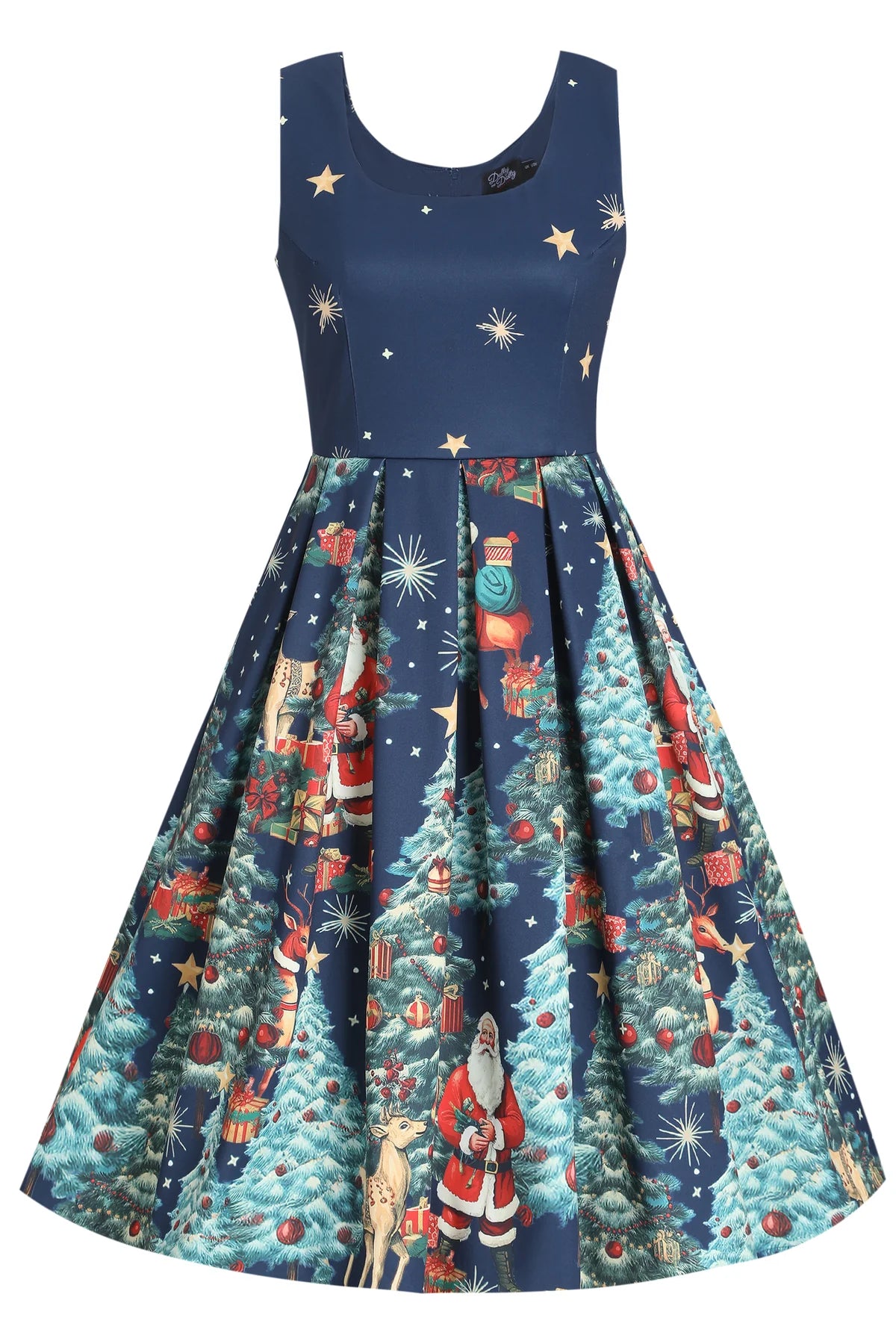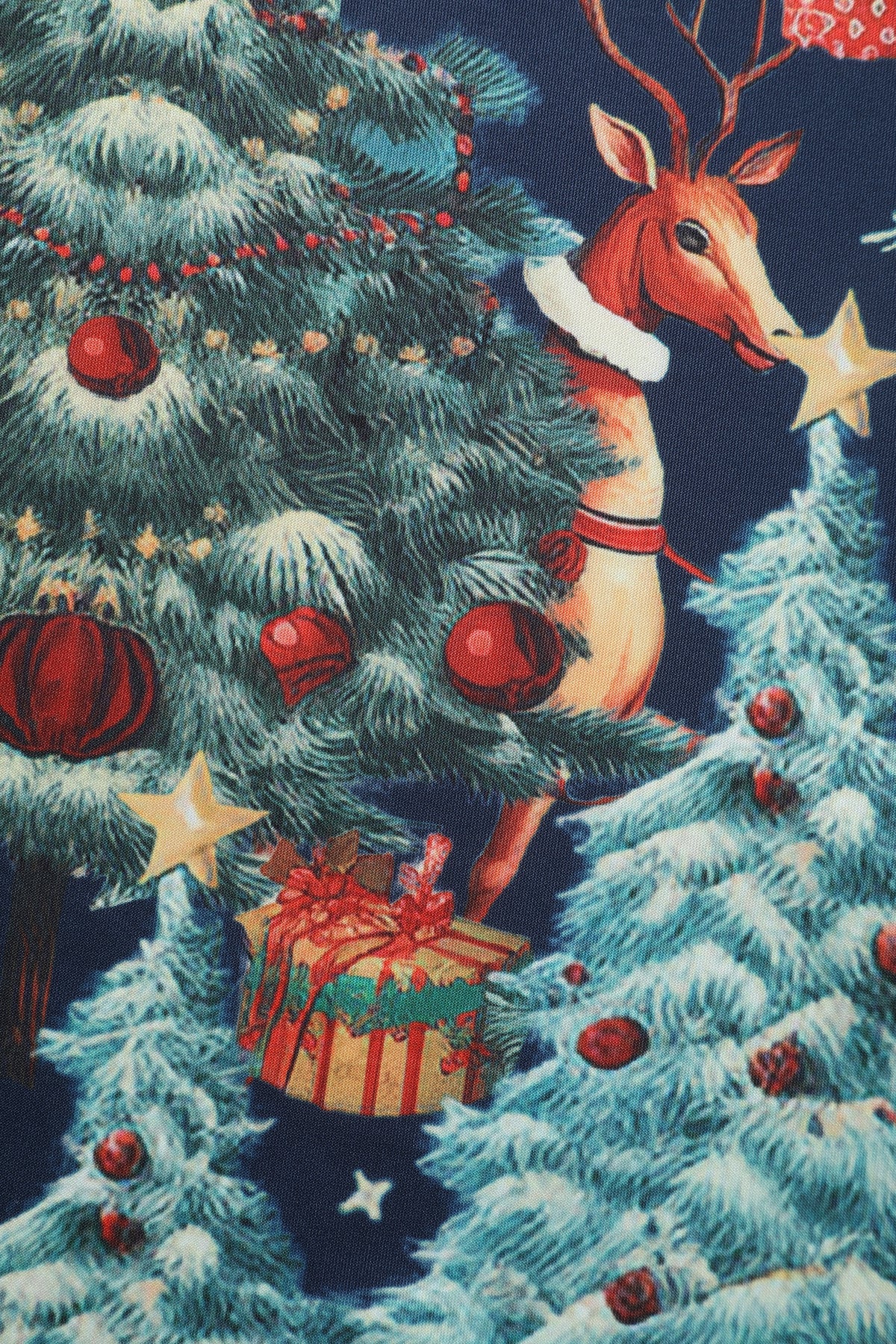 Print: Santa Claus, Christmas Trees and Reindeers on Dark Desaturated blue