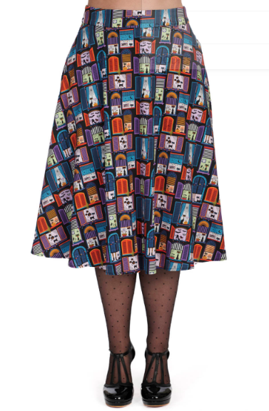 97% COTTON WITH 3% ELASTANE FOR INCREDIBLE COMFORT & FIT. THIS VERY CUTE HALLOWEEN CAT PRINT IS A SWEET SPOOK FOR ANY WINTER SEASON . THIS SWING 1950'S SKIRT HAS CENTRE BACK OPENING WITH BACK ZIP AND SIDE POCKETS.
