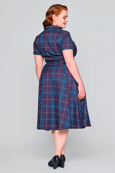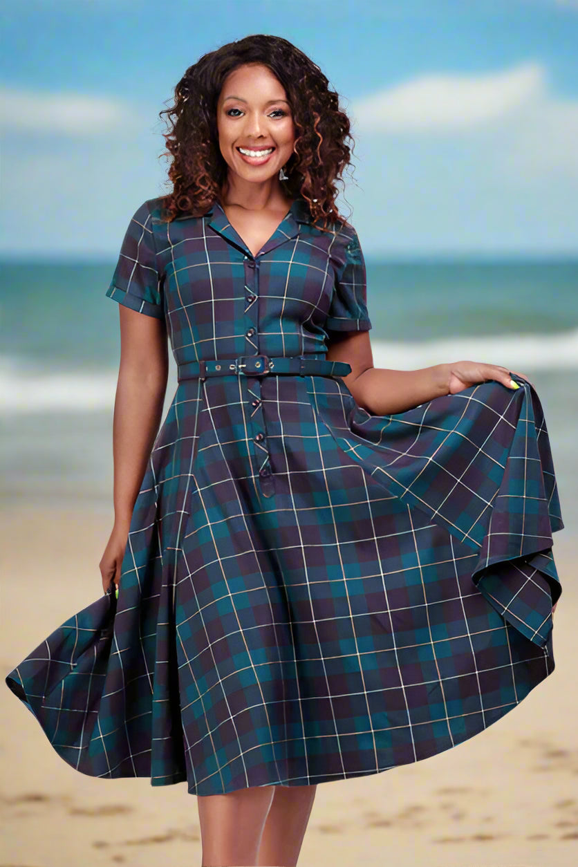 Look at this dress, isn’t it neat? Our Caterina Mermaid Check Swing Dress is the perfect addition to your vintage-inspired wardrobe. This is a classic 50s shirtwaist style piece with a swing skirt that comes to approximately just below the knee, that looks amazing worn with or without a petticoat. The skirt even has pockets! Caterina is fitted on the body with short turn-up sleeves and an open notch collar, fastening up the front with buttons. This is cinched at the waist with a matching check belt with a sturdy PU-backing. This sublime woven check is a bespoke pattern made up of purple and teal with white lines running through . We think this looks stunning paired with a Winona Hair Flower in purple, and maybe a dinglehopper!