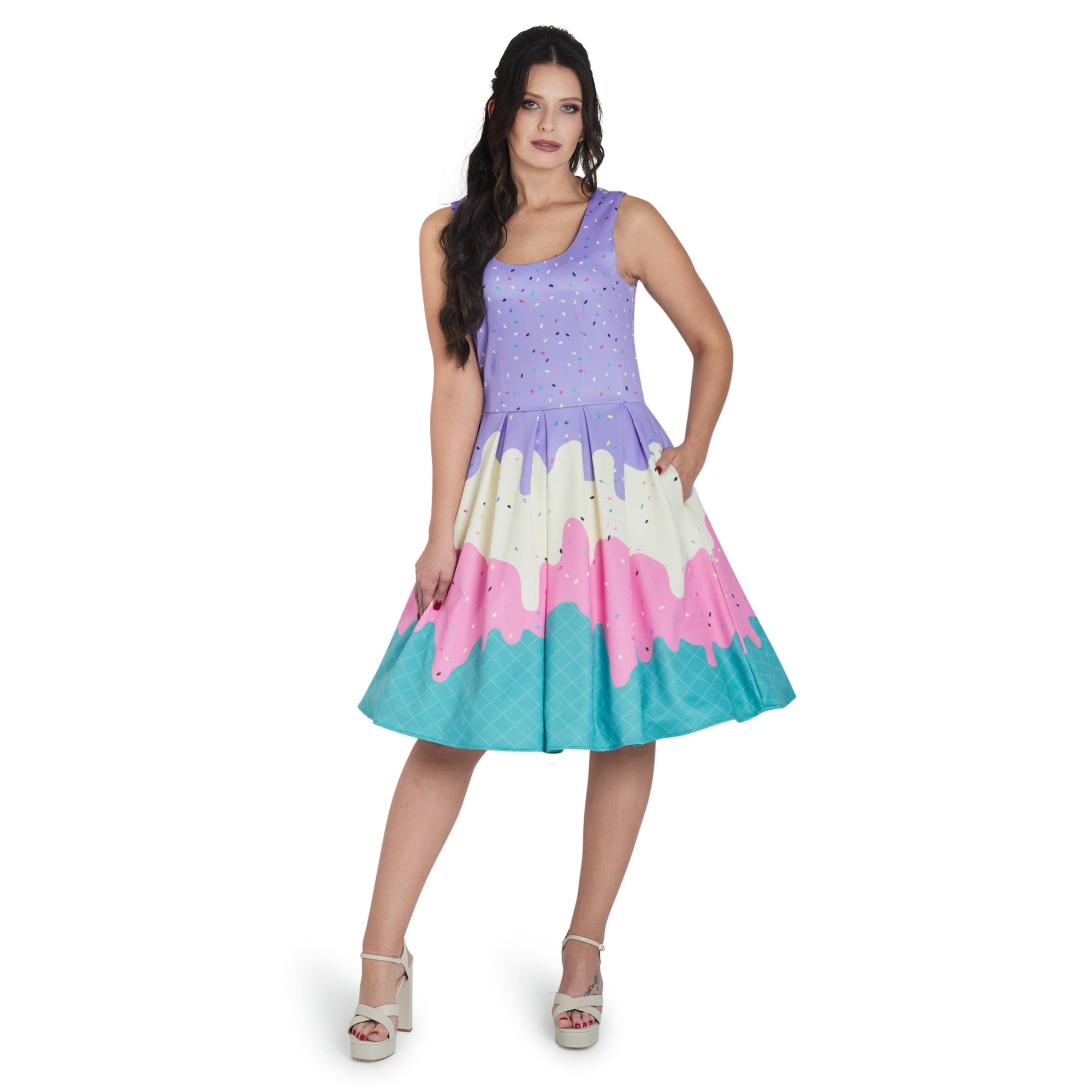 This retro frock features a lovely flattering fitted bodice, a scoop neckline and a 50's swinging skirt with box pleats. The Amanda dress is made from super soft-touch polyester with stretch. It features 2 side hidden pockets and a hidden back zip.