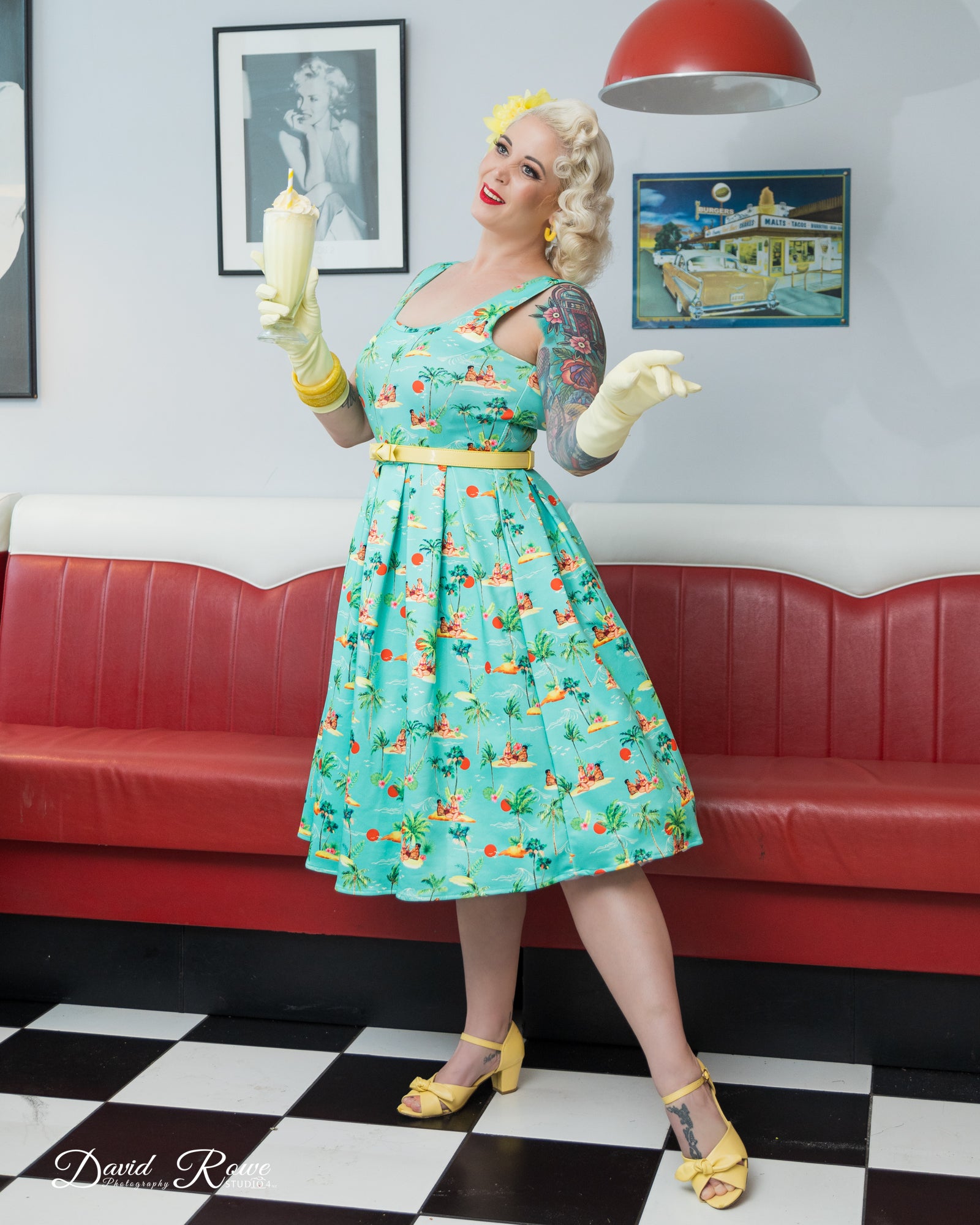 Whether you're dressing up for a day out or just want to add some fun to your style, this dress is sure to impress. It features a flattering fitted bodice that can be dressed up or down, a pretty scoop neckline, a 50s swinging skirt with box pleats, and a concealed zip at the back. Made from very soft fabric with generous stretch, this piece will make you stand out from the crowd, while still feeling comfortable. And who doesn't love pockets?