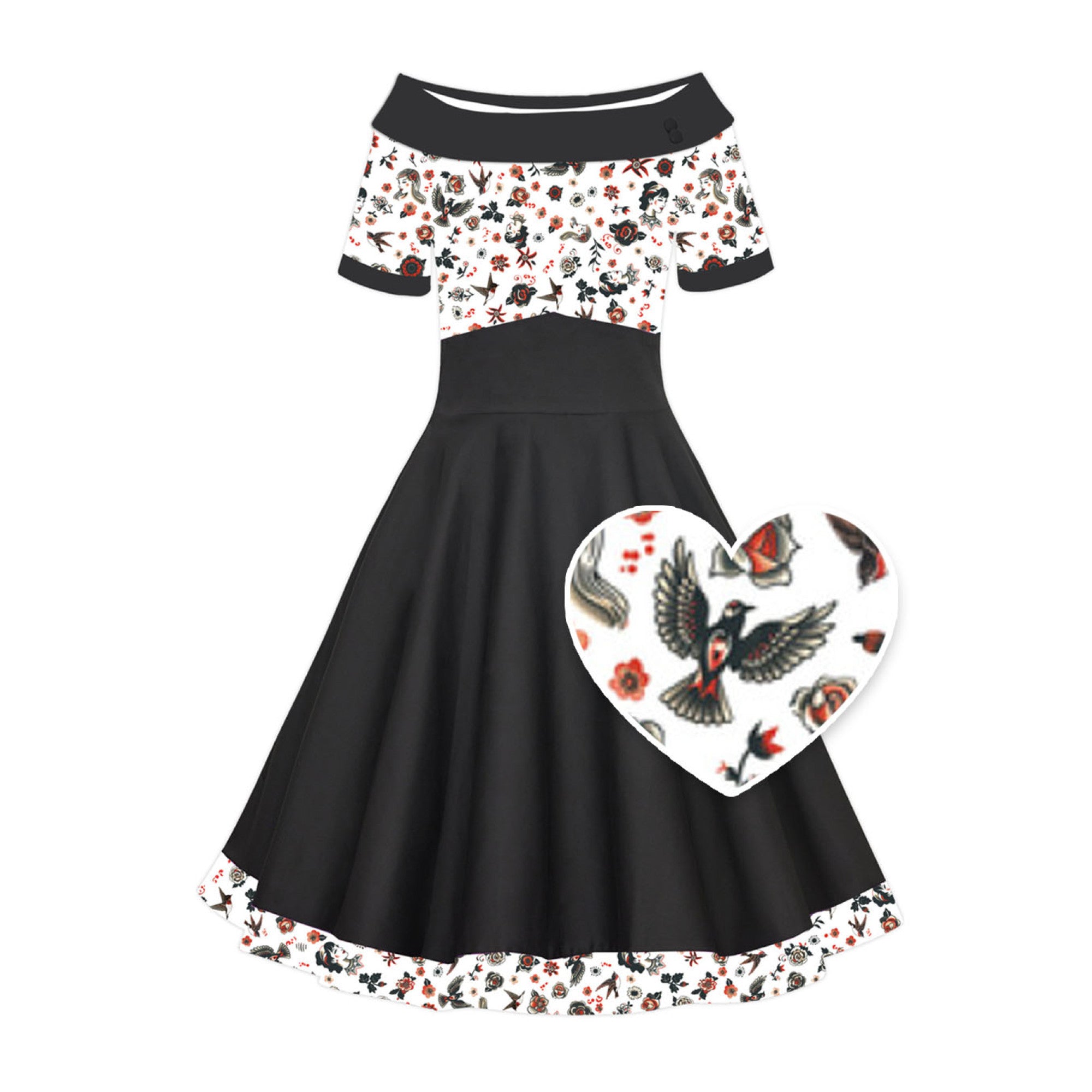 Introducing the essential Darlene dress, a must-have addition to your shop. This 50s style dress features flattering short sleeves, a wide-fitted waistband, a vintage off-the-shoulder neckline with button detail, and a vintage flared skirt that accentuates the figure flawlessly. To maintain a flattering fit, it fastens with a concealed side zip. Made from very soft cotton with generous stretch, this dress ensures both style and comfort for your customers.