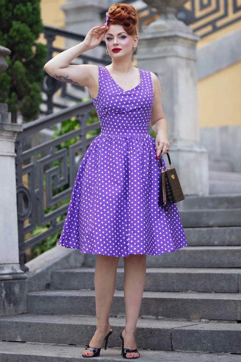Our sassy May swing dress is essential for every pin up girls wardrobe! Featuring an ultra flattering V-neck wrap style bust, pretty full skirt, fitted waistband and hidden zip fastening. Made from super soft cotton with stretch, this classic vintage style dress will create an enviable 50s hourglass silhouette. And it has pockets!