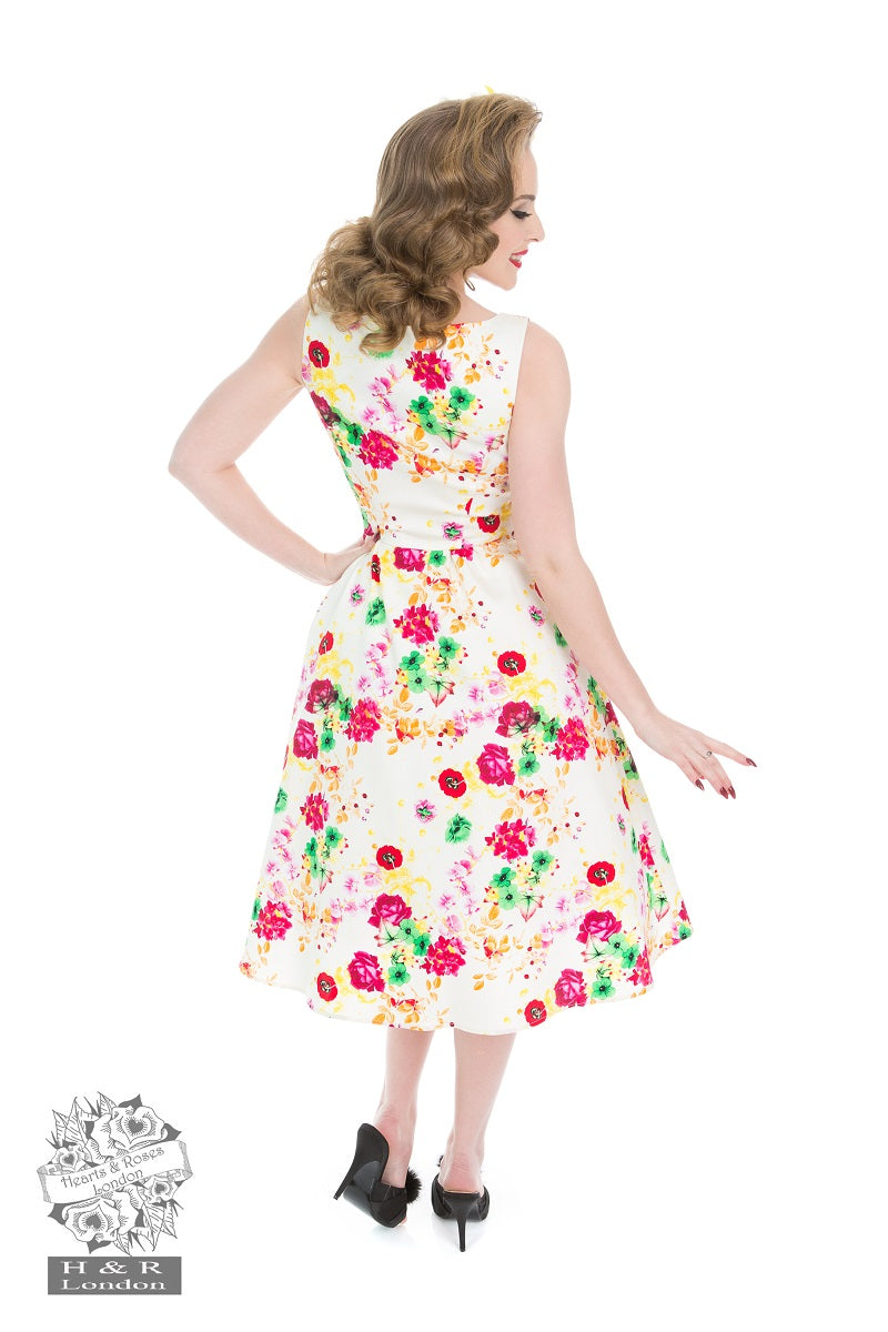 Hearts & Roses new enchanting summer floral dress is a beautiful ivory cotton swing dress with a lovely floral pattern of pink, blue and luscious purple bloom. Perfect for summer; the light colour with cornflowers and azaleas allows you to shine wherever you may be! A bateau neckline with full swing skirt and a sleeveless silhouette with buttons detail over the chest. There are small ruched pleats around the waist. The dress is made of a comfortable stretchy cotton blend.