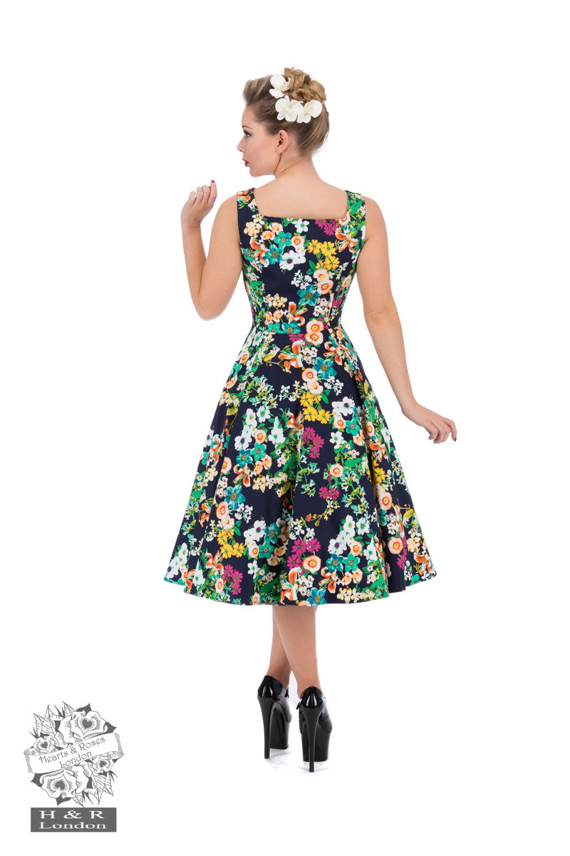Brighten your day with H&R's Eternal Floral Day Dress! Our gorgeous print consists of a dark navy blue background with bright multi-colored flowers mixed in. The dress has square neckline with two eye cut out for a prefect look.