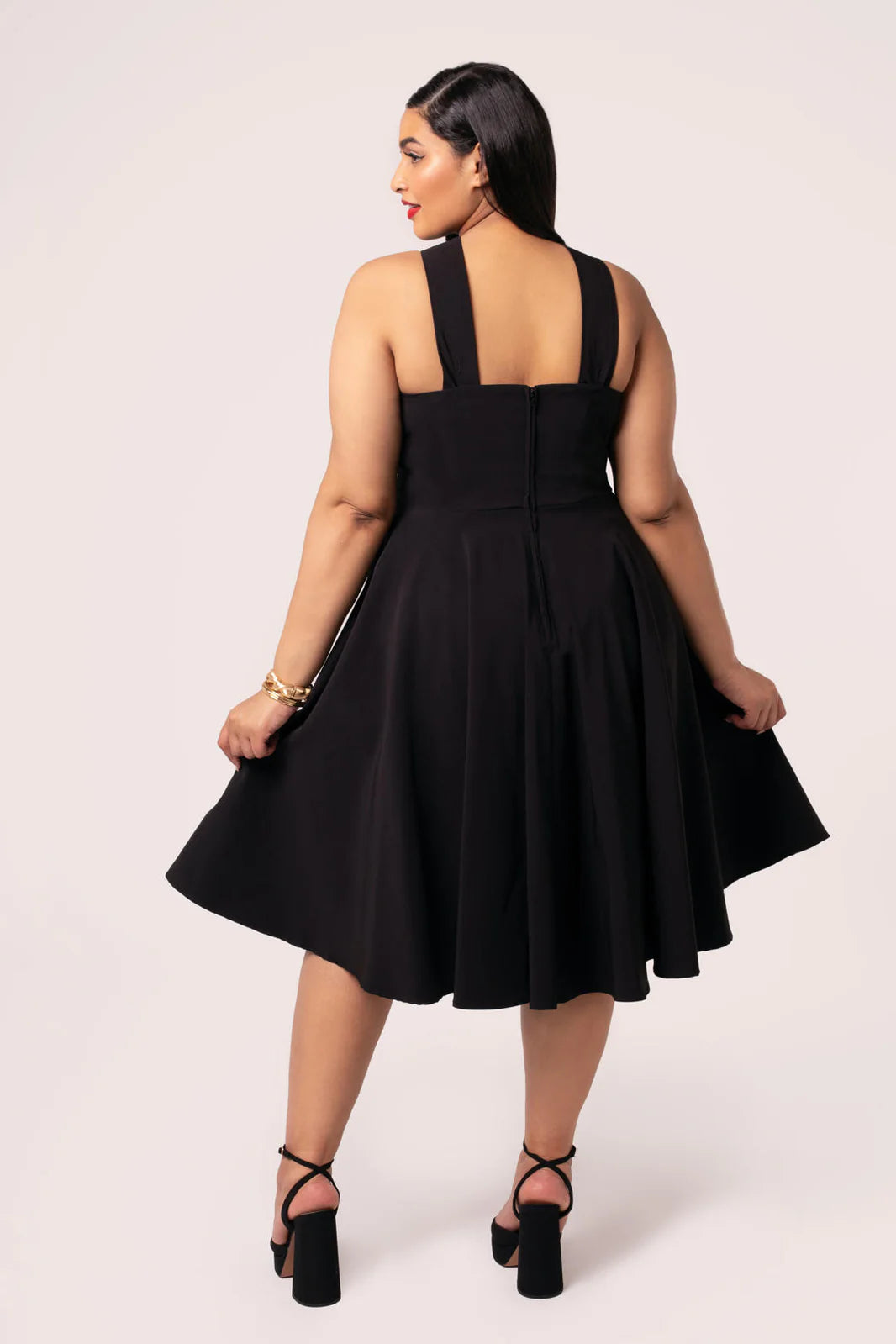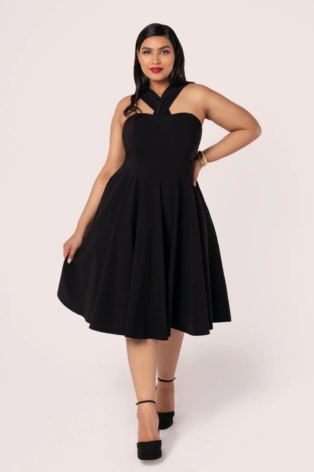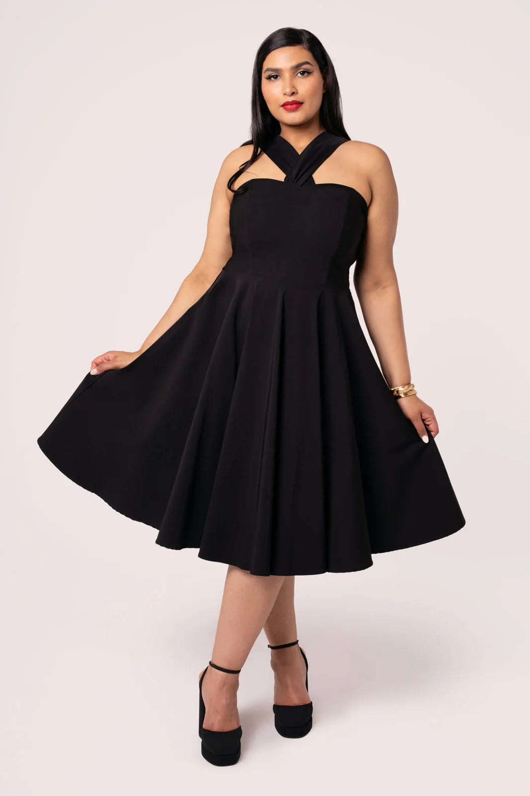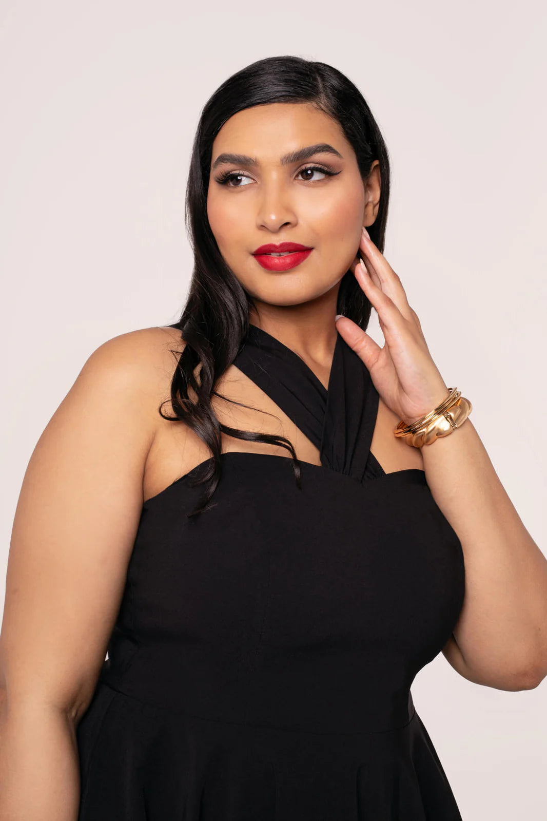 Have your Marilyn moment with The Gina Dress. This glamorous, 50’s style dress comes in timeless shades of black or red Bengaline fabric. The crossover straps adjust with buttons at the back, and gracefully cross the neck to meet a flirty sweetheart neckline. The fitted bodice features princess seams that run over the bust, before finishing at the waistline for a flattering fit. The flared skirt adds volume and twirl factor, with hidden pockets in the side seams to keep your essentials safe whilst you dance the night away.