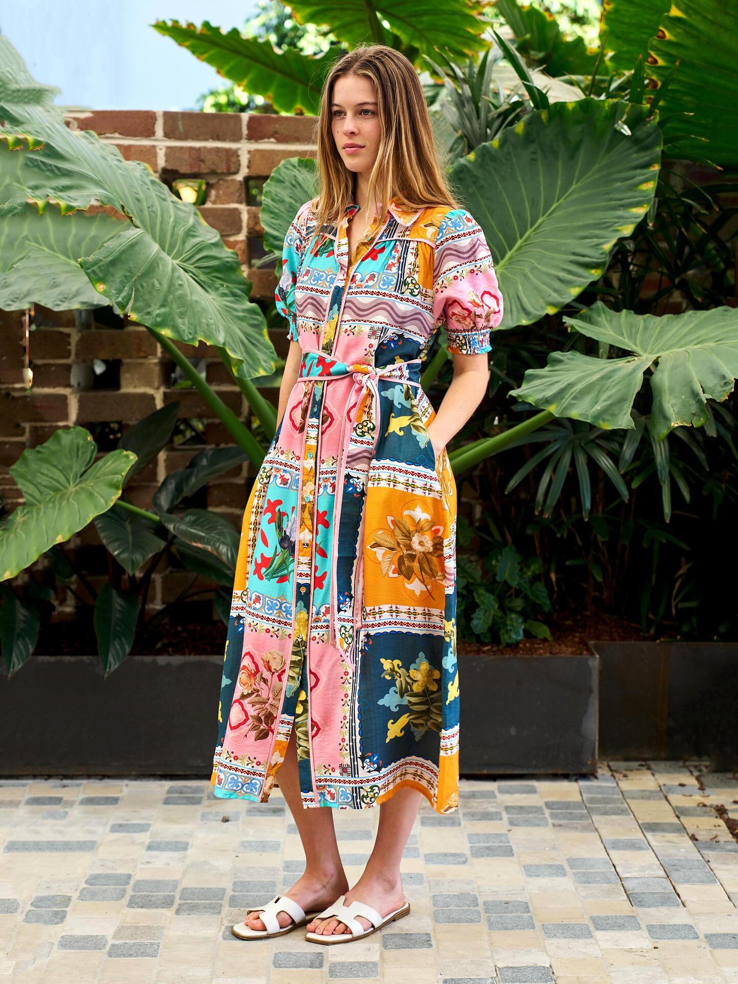 | Descriptions | – Collar v-neckline – Button front detail – Short puff sleeves – Shirred elastic cuff – No tiered skirt – Side seam pockets – Self fabric belt – Piping trim at neckline, front yoke, and front placket and hem |