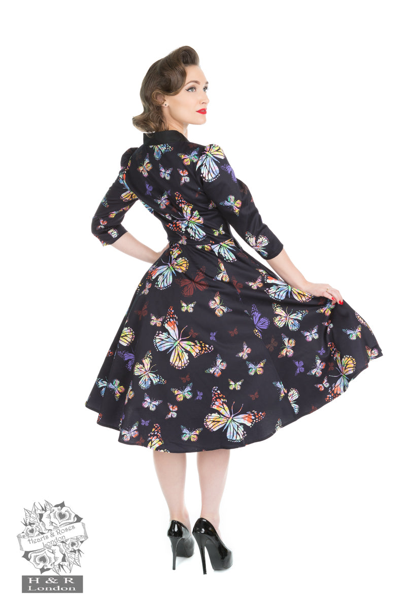When in doubt, go with Butterfly! A beautiful swing dress, new from Hearts & Roses London. It is made out of a stretchy cotton blend fabric. Whimsical cute and colourful butterflies on a dark chocolate background creates the perfect autumn/winter dress. It has a V shaped neckline with black trim, ¾ sleeve and side pockets, thus making this dress a flattering fit.