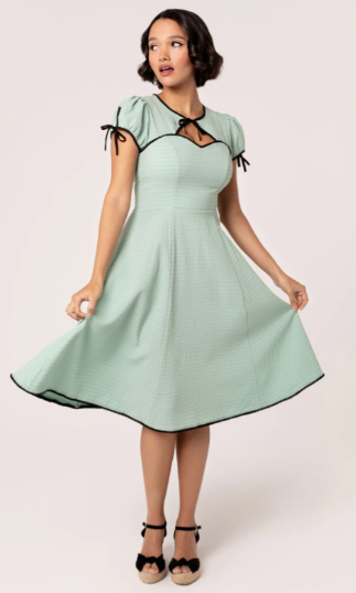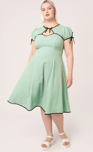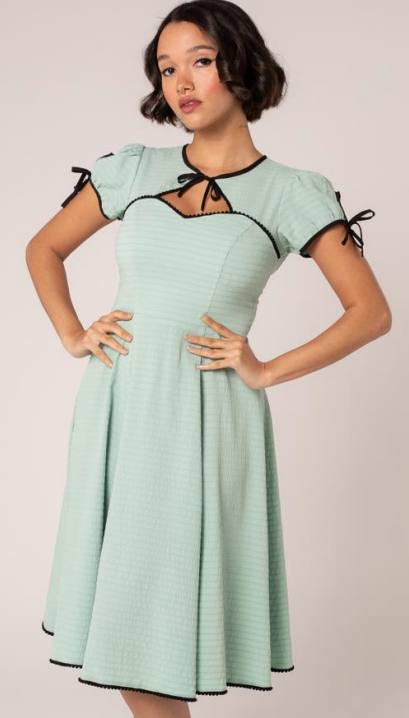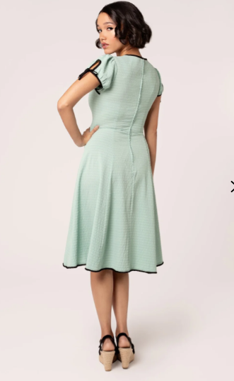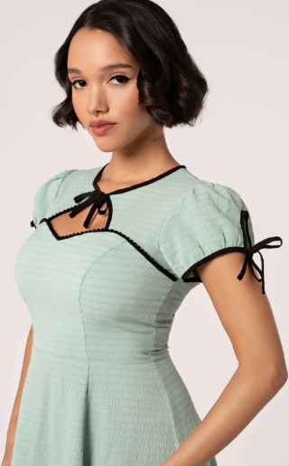 - Short cap sleeves wth black piping on cuffs with adjustable bows