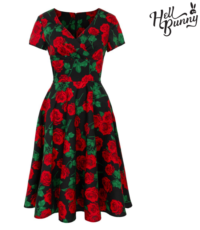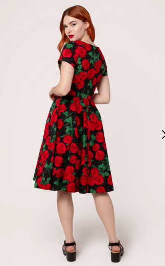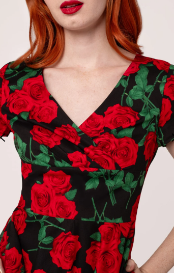 - Black base with large print of red rose stems scattered