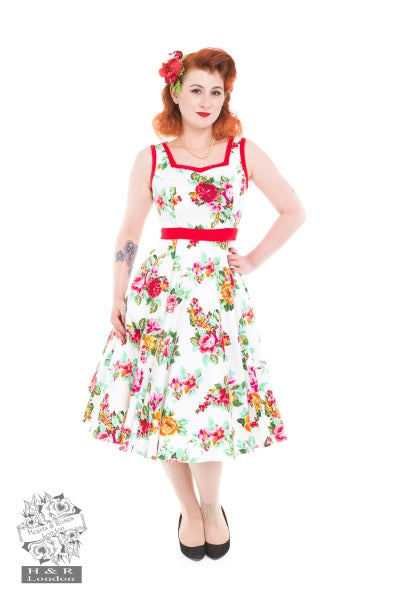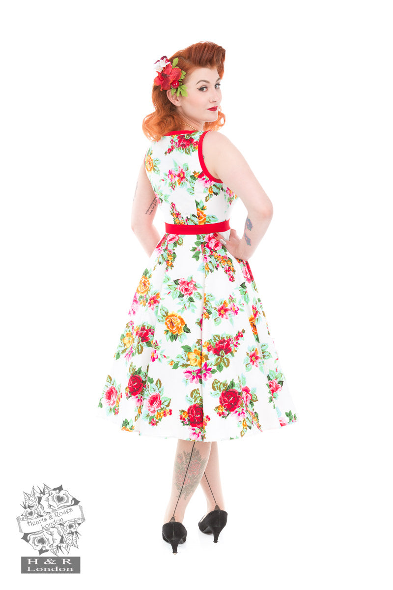 The Lizzy Rose Swing Dress is a rhapsody in White. A sleeveless swing dress with a nipped waist. The Lizzy dress features beautiful bouquets of wildflowers throughout. Detailing with orange, yellow, and light blue flowers contrasting with a red band on the waistline, neckline and shoulders, which makes the Lizzy Dress a standout. The dress has a sweetheart neckline with symmetrical side notches and an empire waistline. Dress flares into a full swing skirt that would be greatly enhanced with an H&R petticoat! Dress is made of soft stretchy cotton and hits below the knee. Zips up the side.