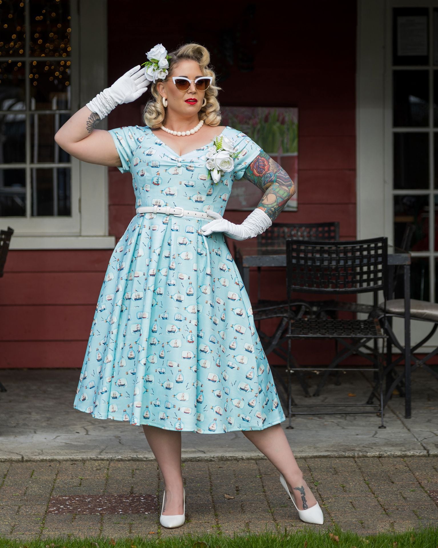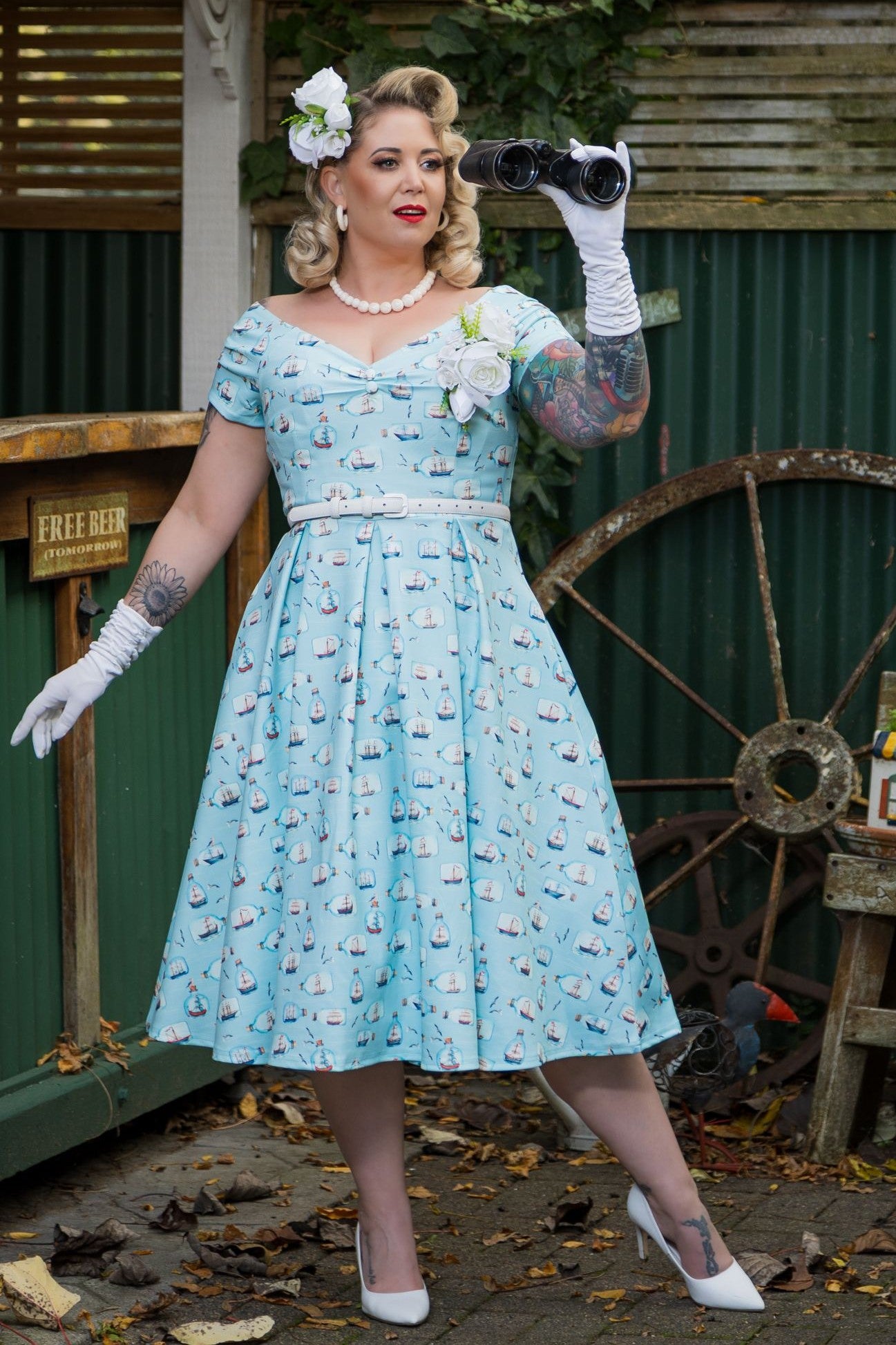 Turn heads and steal the spotlight with our stunning nautical print Lily dress! The off-shoulder neckline, complete with chic matching buttons, is designed to highlight your collarbone and add a touch of effortless glamour. The fitted bodice cinches at the waist, creating a jaw-dropping hourglass figure, while the full-circle skirt flows with every movement, giving you the freedom to dance the night away. Whether you're attending a garden party or going on holiday, the Lily dress guarantees all eyes will be on you. Oh, and did we mention—it has pockets?! Perfect for stashing your essentials while you shine.