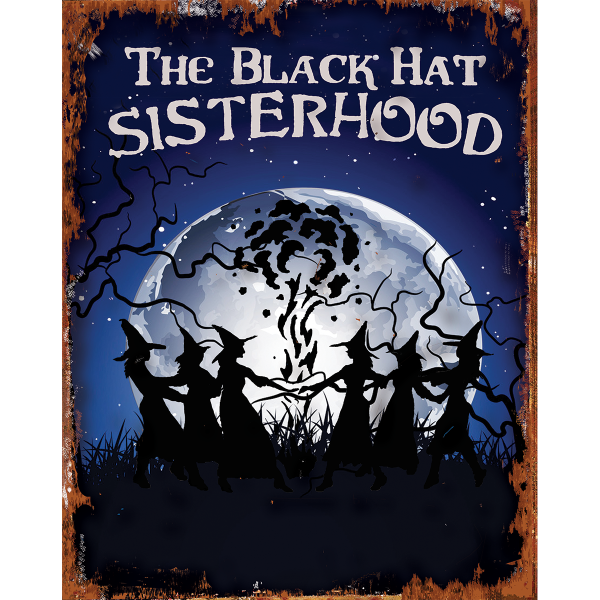 Black Hat Sisterhood Tin Sign. Measures 40cm x 32cm. Printed directly on tin. Predrilled holes for easy hanging.