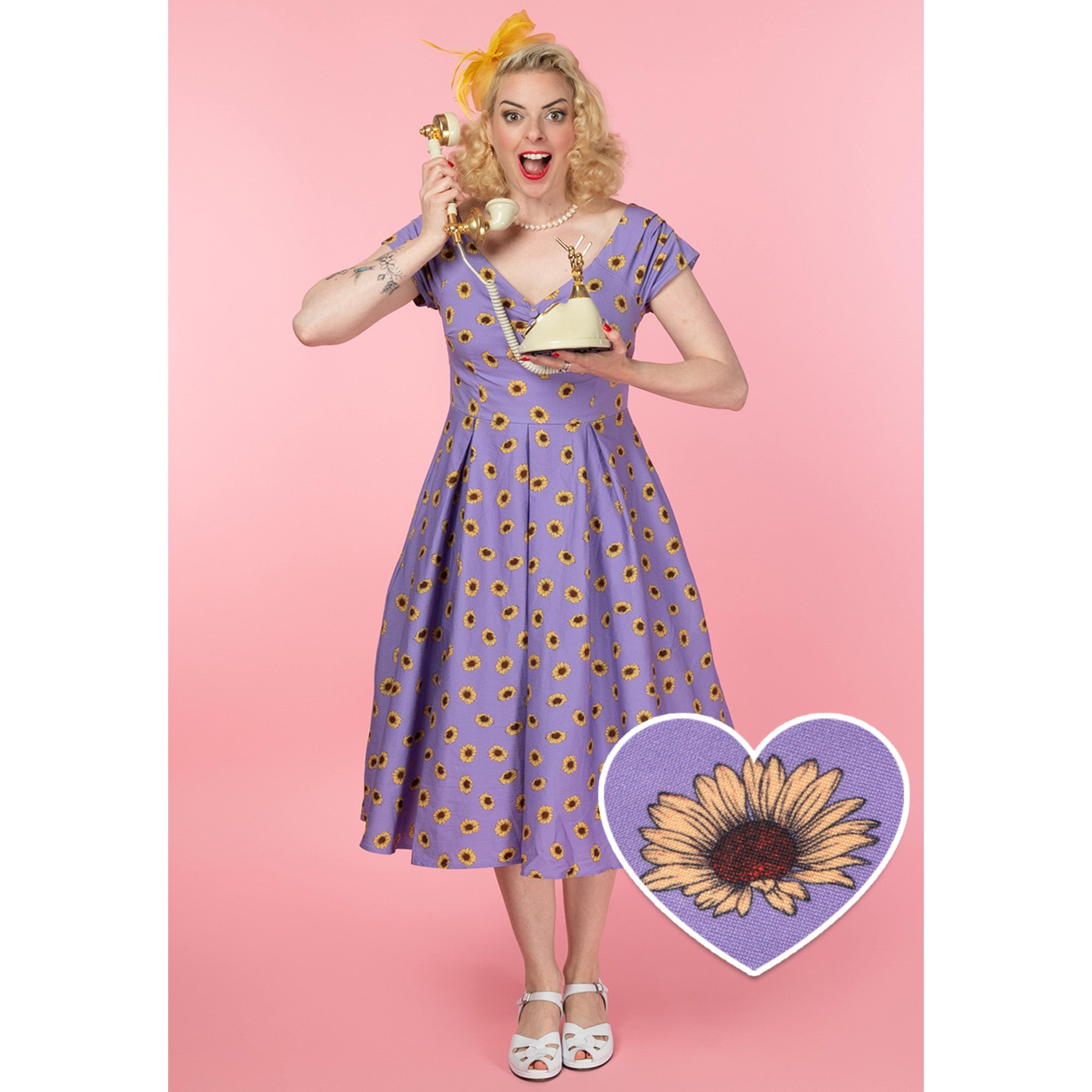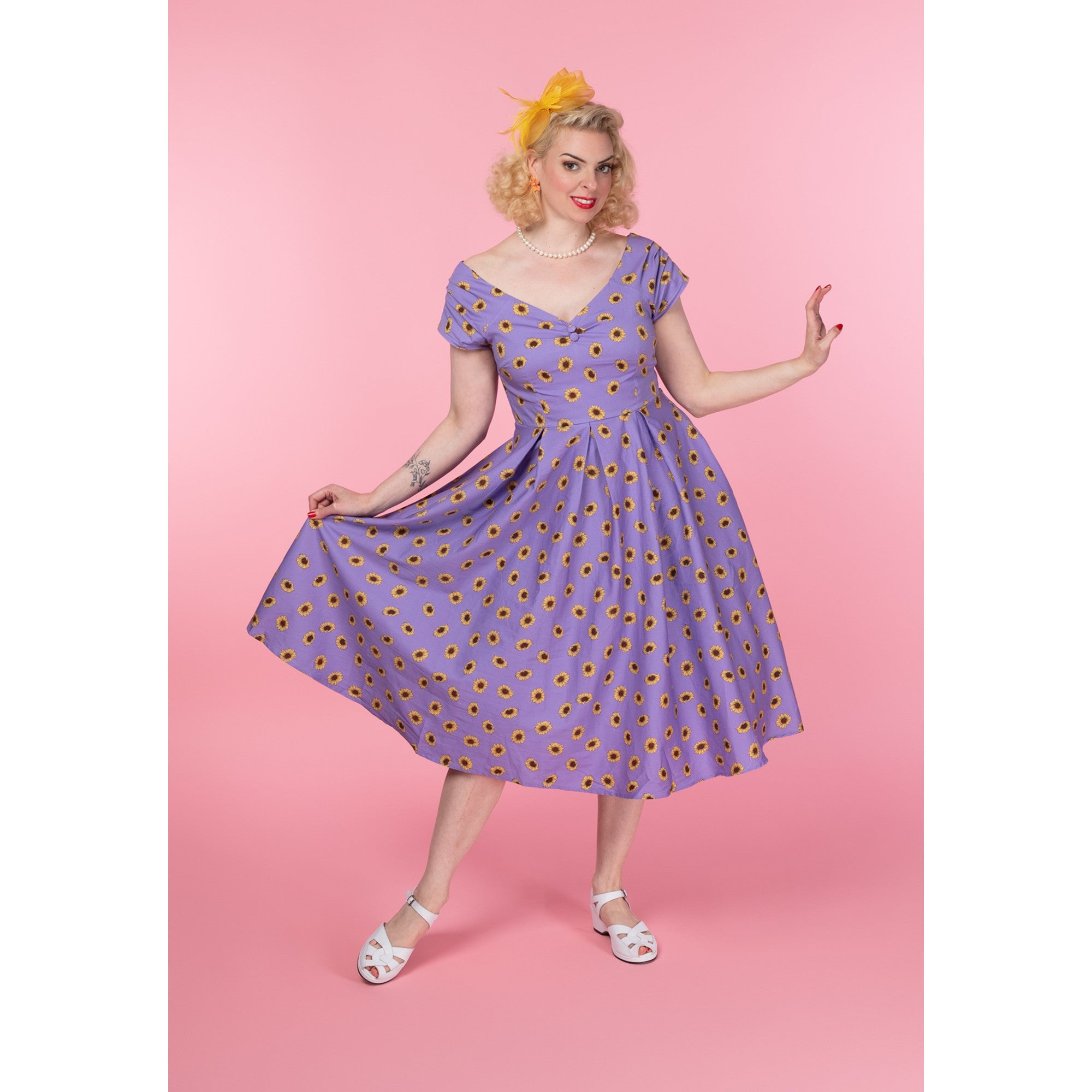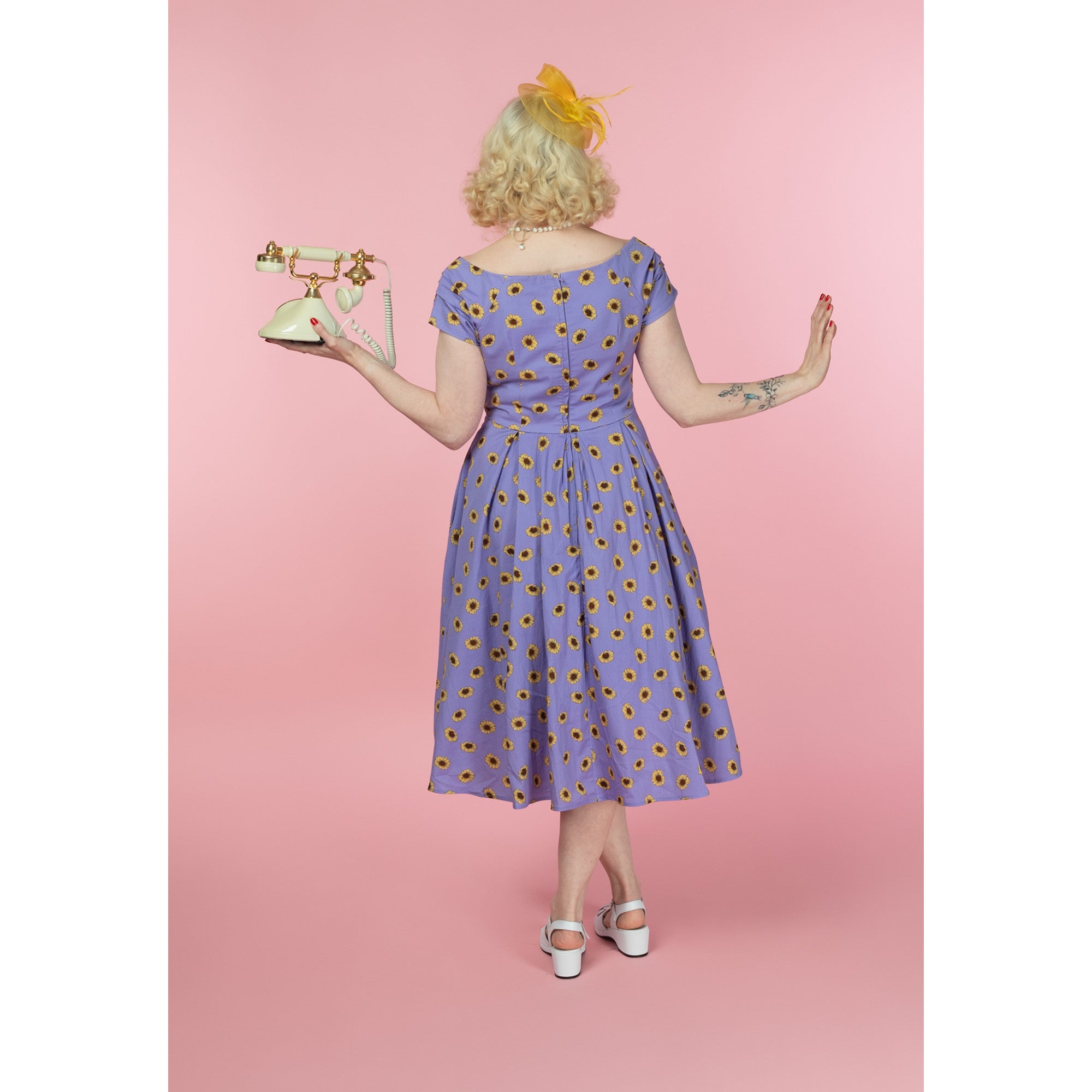 Meet Lily, our gorgeous swing dress with beautiful off-the-shoulder sleeves, a sweetheart neckline, a pretty gathered bust with button detail, a flattering fitted waist, hidden pockets, and a 50s style pleated, flared skirt. This seductive style fastens at the back with a hidden zip made from lovely soft cotton with stretch, and a fully lined top. A vintage wardrobe is essential!