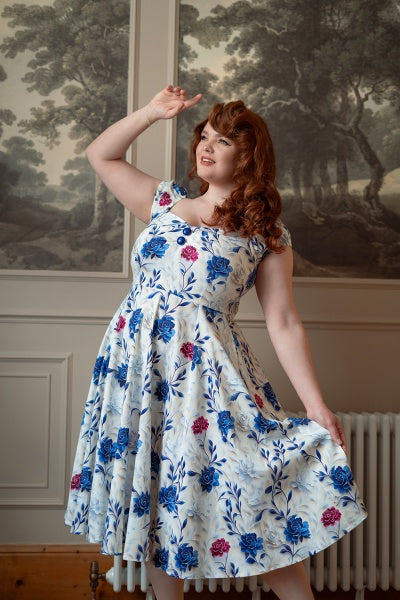 Soft, romantic, and beautifully timeless, the Wildflower Swing Dress brings a touch of countryside elegance to an enchanting vintage silhouette. Set on a gentle ivory backdrop, the dress is adorned with sweeping cobalt blossoms and delicate berry accents, creating a striking floral print that feels both classic and fresh. The off-shoulder neckline with softly gathered sleeves adds a graceful, feminine touch, framing the shoulders with effortless charm. A fitted bodice shapes the waist before falling into a full 1950s style swing skirt, offering beautiful movement and the signature Hearts & Roses London hourglass silhouette. Crafted from our cotton fabric, the Wildflower Swing Dress is perfect for warm days, garden gatherings, and any moment that calls for a romantic vintage flourish.