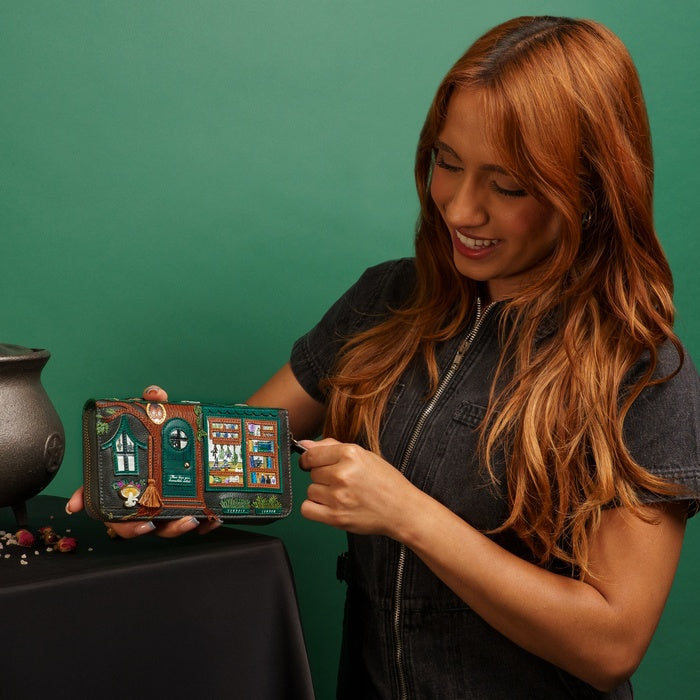 Forget black magic—you’ll fall for the Witches Pantry Large Ziparound Wallet instantly. Designed to fit in your handbag or backpack, it features several card slots, a zippered coin section, and slip pockets for receipts and notes. Its secure ziparound closure keeps everything safe from goblins (or nosy familiars). Made from vegan leather, it’s decorated with a wooden witch house, potions, and our mischievous witch cat and spider. Trick or treat? We say treat!